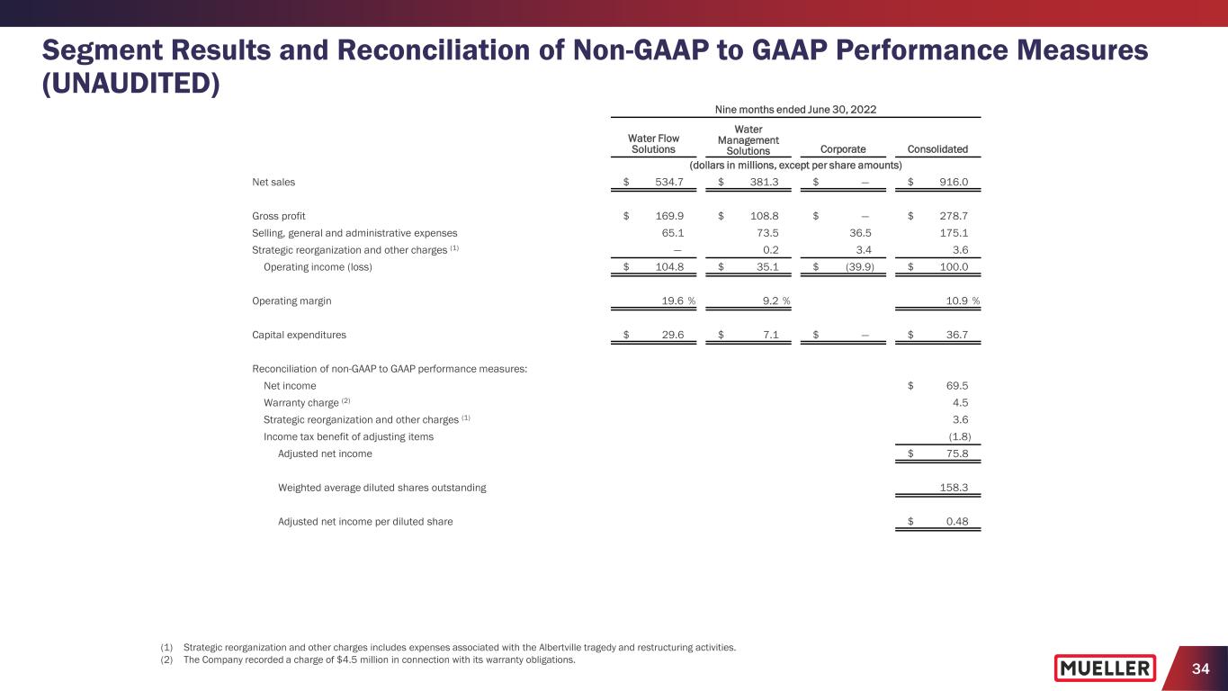 33 Segment Results and Reconciliation of Non-GAAP to GAAP Performance Measures (UNAUDITED) Nine months ended June 30, 2023 Water Flow Solutions Water Management Solutions Corporate Consolidated (dollars in millions, except per share amounts) Net income $ 68.3 Income tax expense (2) 20.0 Interest expense, net (2) 11.4 Pension expense other than service (2) 2.8 Operating income (loss) $ 52.0 $ 90.3 $ (39.8) 102.5 Strategic reorganization and other charges (benefits) (1) 0.1 1.2 (0.4) 0.9 Adjusted operating income (loss) 52.1 91.5 (40.2) 103.4 Pension benefit other than service — — (2.8) (2.8) Depreciation and amortization 23.7 22.3 0.1 46.1 Adjusted EBITDA $ 75.8 $ 113.8 $ (42.9) $ 146.7 Adjusted operating margin 11.0 % 18.2 % 10.6 % Adjusted EBITDA margin 16.0 % 22.7 % 15.1 % Reconciliation of free cash flow to net cash provided by operating activities: Net cash provided by operating activities $ 52.5 Less capital expenditures 32.4 Free cash flow $ 20.1 (1) Strategic reorganization and Strategic reorganization and other charges (benefits) includes severance and certain transaction-related expenses partially offset by a gain on the sale of our facility in Aurora, Illinois. (2) The Company does not allocate interest, income taxes or pension benefit (expense) other than service to its segments.