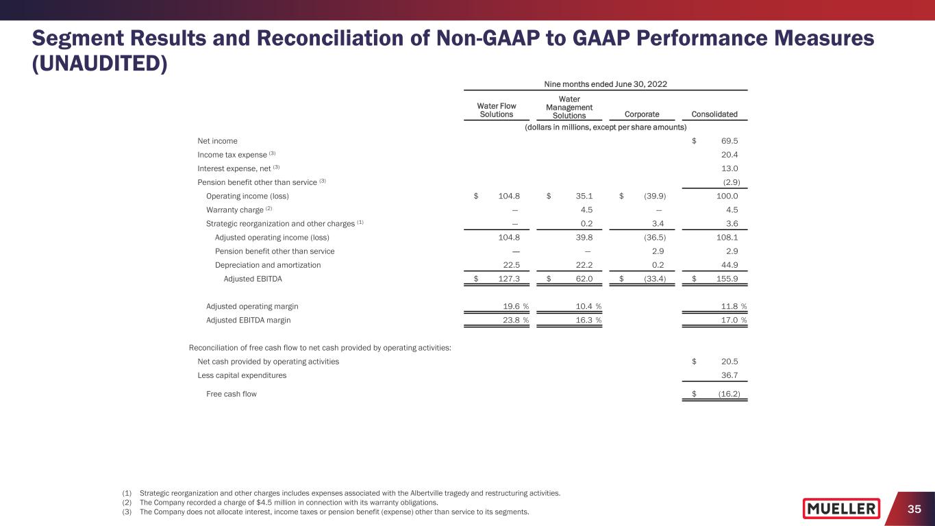34 Segment Results and Reconciliation of Non-GAAP to GAAP Performance Measures (UNAUDITED) (1) Strategic reorganization and other charges includes expenses associated with the Albertville tragedy and restructuring activities. (2) The Company recorded a charge of $4.5 million in connection with its warranty obligations. Nine months ended June 30, 2022 Water Flow Solutions Water Management Solutions Corporate Consolidated (dollars in millions, except per share amounts) Net sales $ 534.7 $ 381.3 $ — $ 916.0 Gross profit $ 169.9 $ 108.8 $ — $ 278.7 Selling, general and administrative expenses 65.1 73.5 36.5 175.1 Strategic reorganization and other charges (1) — 0.2 3.4 3.6 Operating income (loss) $ 104.8 $ 35.1 $ (39.9) $ 100.0 Operating margin 19.6 % 9.2 % 10.9 % Capital expenditures $ 29.6 $ 7.1 $ — $ 36.7 Reconciliation of non-GAAP to GAAP performance measures: Net income $ 69.5 Warranty charge (2) 4.5 Strategic reorganization and other charges (1) 3.6 Income tax benefit of adjusting items (1.8) Adjusted net income $ 75.8 Weighted average diluted shares outstanding 158.3 Adjusted net income per diluted share $ 0.48