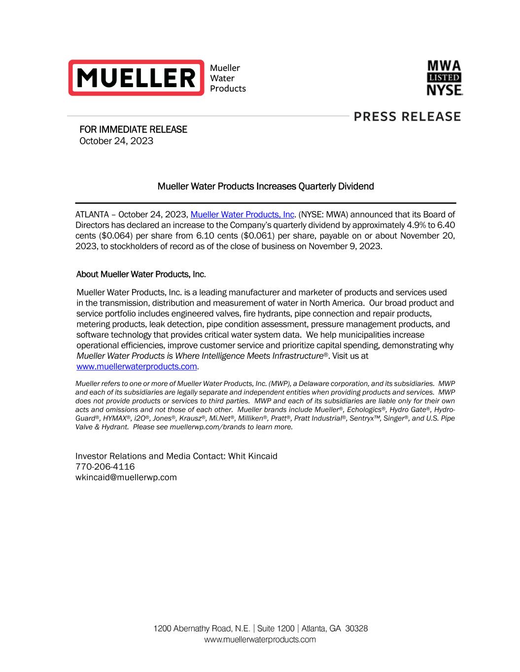 Mueller Water Products Increases Quarterly Dividend ATLANTA – October 24, 2023, Mueller Water Products, Inc. (NYSE: MWA) announced that its Board of Directors has declared an increase to the Company’s quarterly dividend by approximately 4.9% to 6.40 cents ($0.064) per share from 6.10 cents ($0.061) per share, payable on or about November 20, 2023, to stockholders of record as of the close of business on November 9, 2023. About Mueller Water Products, Inc. Mueller Water Products, Inc. is a leading manufacturer and marketer of products and services used in the transmission, distribution and measurement of water in North America. Our broad product and service portfolio includes engineered valves, fire hydrants, pipe connection and repair products, metering products, leak detection, pipe condition assessment, pressure management products, and software technology that provides critical water system data. We help municipalities increase operational efficiencies, improve customer service and prioritize capital spending, demonstrating why Mueller Water Products is Where Intelligence Meets Infrastructure®. Visit us at www.muellerwaterproducts.com. Mueller refers to one or more of Mueller Water Products, Inc. (MWP), a Delaware corporation, and its subsidiaries. MWP and each of its subsidiaries are legally separate and independent entities when providing products and services. MWP does not provide products or services to third parties. MWP and each of its subsidiaries are liable only for their own acts and omissions and not those of each other. Mueller brands include Mueller®, Echologics®, Hydro Gate®, Hydro- Guard®, HYMAX®, i2O®, Jones®, Krausz®, Mi.Net®, Milliken®, Pratt®, Pratt Industrial®, Sentryx™, Singer®, and U.S. Pipe Valve & Hydrant. Please see muellerwp.com/brands to learn more. Investor Relations and Media Contact: Whit Kincaid 770-206-4116 wkincaid@muellerwp.com FOR IMMEDIATE RELEASE October 24, 2023