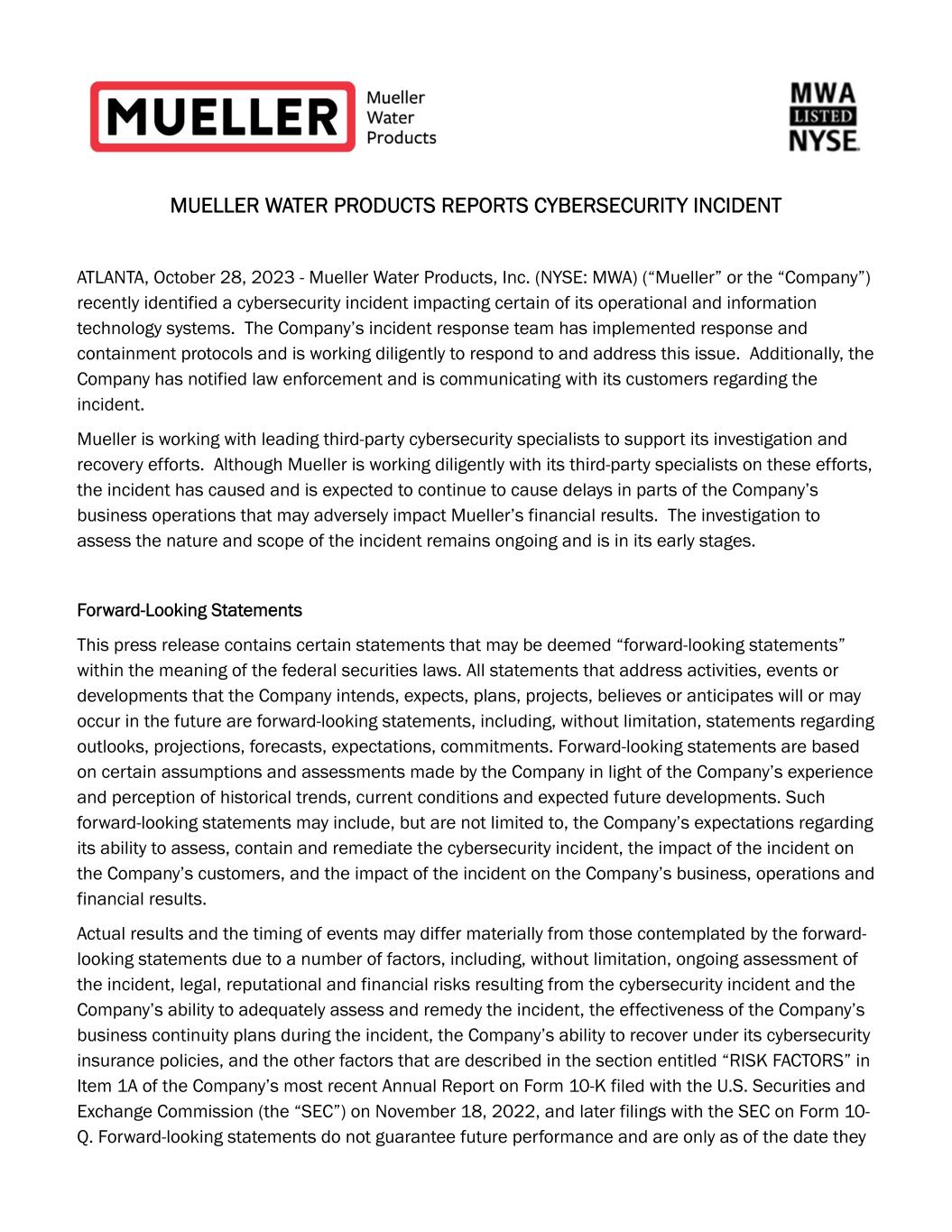MUELLER WATER PRODUCTS REPORTS CYBERSECURITY INCIDENT ATLANTA, October 28, 2023 - Mueller Water Products, Inc. (NYSE: MWA) (“Mueller” or the “Company”) recently identified a cybersecurity incident impacting certain of its operational and information technology systems. The Company’s incident response team has implemented response and containment protocols and is working diligently to respond to and address this issue. Additionally, the Company has notified law enforcement and is communicating with its customers regarding the incident. Mueller is working with leading third-party cybersecurity specialists to support its investigation and recovery efforts. Although Mueller is working diligently with its third-party specialists on these efforts, the incident has caused and is expected to continue to cause delays in parts of the Company’s business operations that may adversely impact Mueller’s financial results. The investigation to assess the nature and scope of the incident remains ongoing and is in its early stages. Forward-Looking Statements This press release contains certain statements that may be deemed “forward-looking statements” within the meaning of the federal securities laws. All statements that address activities, events or developments that the Company intends, expects, plans, projects, believes or anticipates will or may occur in the future are forward-looking statements, including, without limitation, statements regarding outlooks, projections, forecasts, expectations, commitments. Forward-looking statements are based on certain assumptions and assessments made by the Company in light of the Company’s experience and perception of historical trends, current conditions and expected future developments. Such forward-looking statements may include, but are not limited to, the Company’s expectations regarding its ability to assess, contain and remediate the cybersecurity incident, the impact of the incident on the Company’s customers, and the impact of the incident on the Company’s business, operations and financial results. Actual results and the timing of events may differ materially from those contemplated by the forward- looking statements due to a number of factors, including, without limitation, ongoing assessment of the incident, legal, reputational and financial risks resulting from the cybersecurity incident and the Company’s ability to adequately assess and remedy the incident, the effectiveness of the Company’s business continuity plans during the incident, the Company’s ability to recover under its cybersecurity insurance policies, and the other factors that are described in the section entitled “RISK FACTORS” in Item 1A of the Company’s most recent Annual Report on Form 10-K filed with the U.S. Securities and Exchange Commission (the “SEC”) on November 18, 2022, and later filings with the SEC on Form 10- Q. Forward-looking statements do not guarantee future performance and are only as of the date they