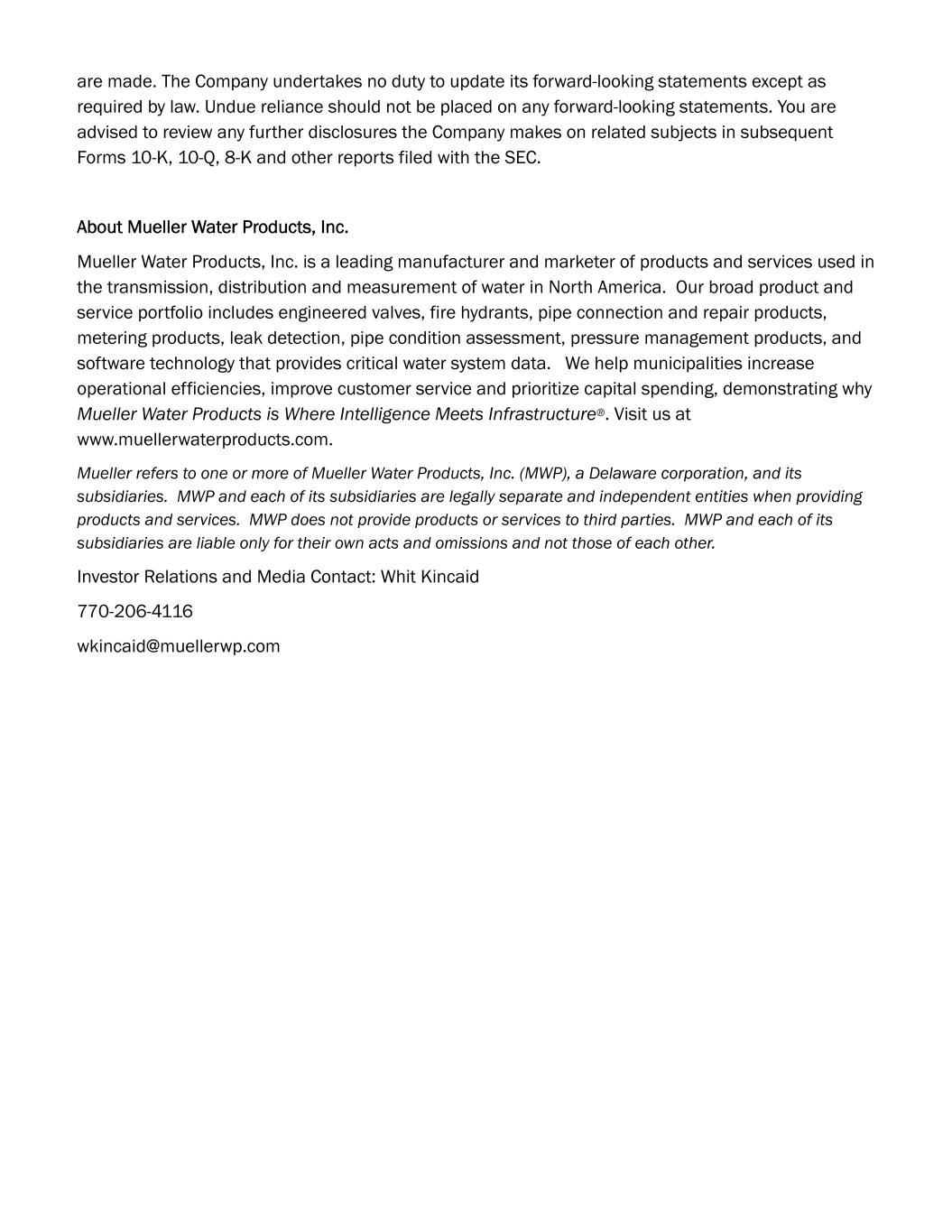 are made. The Company undertakes no duty to update its forward-looking statements except as required by law. Undue reliance should not be placed on any forward-looking statements. You are advised to review any further disclosures the Company makes on related subjects in subsequent Forms 10-K, 10-Q, 8-K and other reports filed with the SEC. About Mueller Water Products, Inc. Mueller Water Products, Inc. is a leading manufacturer and marketer of products and services used in the transmission, distribution and measurement of water in North America. Our broad product and service portfolio includes engineered valves, fire hydrants, pipe connection and repair products, metering products, leak detection, pipe condition assessment, pressure management products, and software technology that provides critical water system data. We help municipalities increase operational efficiencies, improve customer service and prioritize capital spending, demonstrating why Mueller Water Products is Where Intelligence Meets Infrastructure®. Visit us at www.muellerwaterproducts.com. Mueller refers to one or more of Mueller Water Products, Inc. (MWP), a Delaware corporation, and its subsidiaries. MWP and each of its subsidiaries are legally separate and independent entities when providing products and services. MWP does not provide products or services to third parties. MWP and each of its subsidiaries are liable only for their own acts and omissions and not those of each other. Investor Relations and Media Contact: Whit Kincaid 770-206-4116 wkincaid@muellerwp.com