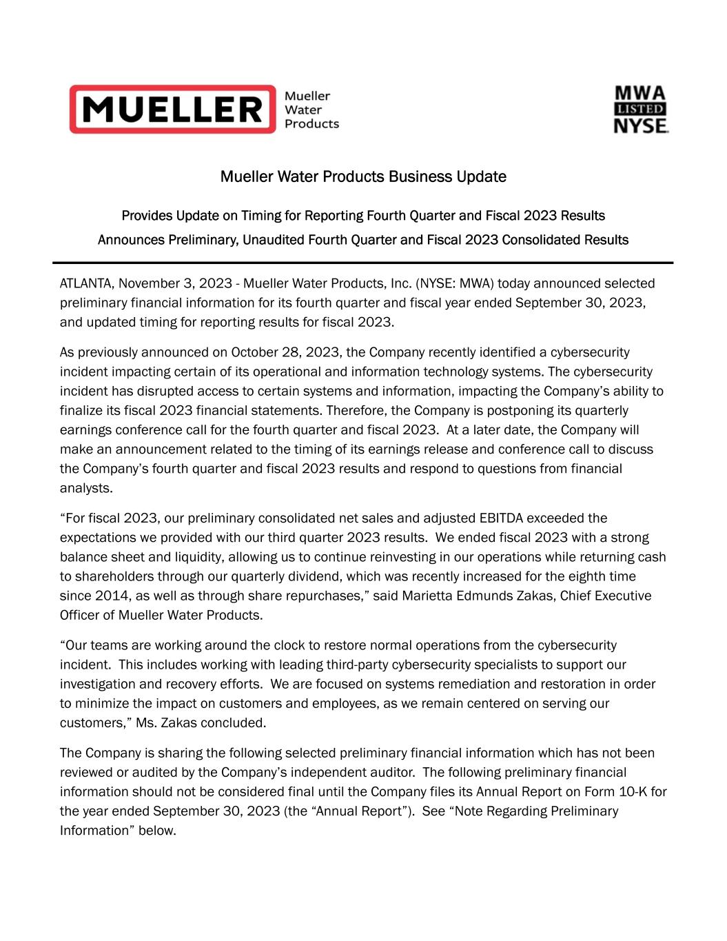 Mueller Water Products Business Update Provides Update on Timing for Reporting Fourth Quarter and Fiscal 2023 Results Announces Preliminary, Unaudited Fourth Quarter and Fiscal 2023 Consolidated Results ATLANTA, November 3, 2023 - Mueller Water Products, Inc. (NYSE: MWA) today announced selected preliminary financial information for its fourth quarter and fiscal year ended September 30, 2023, and updated timing for reporting results for fiscal 2023. As previously announced on October 28, 2023, the Company recently identified a cybersecurity incident impacting certain of its operational and information technology systems. The cybersecurity incident has disrupted access to certain systems and information, impacting the Company’s ability to finalize its fiscal 2023 financial statements. Therefore, the Company is postponing its quarterly earnings conference call for the fourth quarter and fiscal 2023. At a later date, the Company will make an announcement related to the timing of its earnings release and conference call to discuss the Company’s fourth quarter and fiscal 2023 results and respond to questions from financial analysts. “For fiscal 2023, our preliminary consolidated net sales and adjusted EBITDA exceeded the expectations we provided with our third quarter 2023 results. We ended fiscal 2023 with a strong balance sheet and liquidity, allowing us to continue reinvesting in our operations while returning cash to shareholders through our quarterly dividend, which was recently increased for the eighth time since 2014, as well as through share repurchases,” said Marietta Edmunds Zakas, Chief Executive Officer of Mueller Water Products. “Our teams are working around the clock to restore normal operations from the cybersecurity incident. This includes working with leading third-party cybersecurity specialists to support our investigation and recovery efforts. We are focused on systems remediation and restoration in order to minimize the impact on customers and employees, as we remain centered on serving our customers,” Ms. Zakas concluded. The Company is sharing the following selected preliminary financial information which has not been reviewed or audited by the Company’s independent auditor. The following preliminary financial information should not be considered final until the Company files its Annual Report on Form 10-K for the year ended September 30, 2023 (the “Annual Report”). See “Note Regarding Preliminary Information” below.