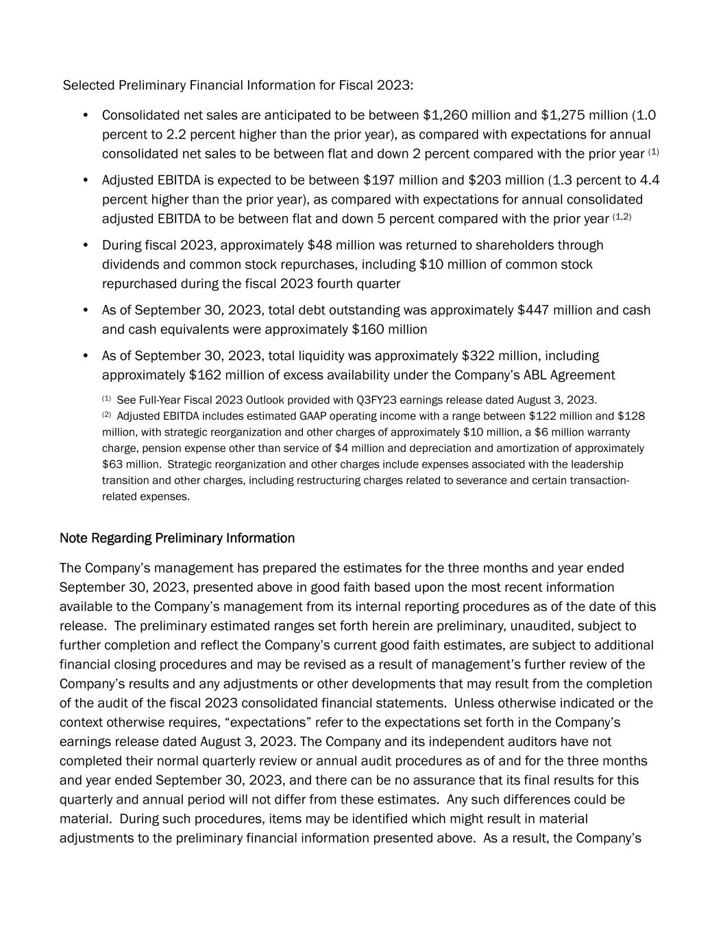 Selected Preliminary Financial Information for Fiscal 2023: • Consolidated net sales are anticipated to be between $1,260 million and $1,275 million (1.0 percent to 2.2 percent higher than the prior year), as compared with expectations for annual consolidated net sales to be between flat and down 2 percent compared with the prior year (1) • Adjusted EBITDA is expected to be between $197 million and $203 million (1.3 percent to 4.4 percent higher than the prior year), as compared with expectations for annual consolidated adjusted EBITDA to be between flat and down 5 percent compared with the prior year (1,2) • During fiscal 2023, approximately $48 million was returned to shareholders through dividends and common stock repurchases, including $10 million of common stock repurchased during the fiscal 2023 fourth quarter • As of September 30, 2023, total debt outstanding was approximately $447 million and cash and cash equivalents were approximately $160 million • As of September 30, 2023, total liquidity was approximately $322 million, including approximately $162 million of excess availability under the Company’s ABL Agreement (1) See Full-Year Fiscal 2023 Outlook provided with Q3FY23 earnings release dated August 3, 2023. (2) Adjusted EBITDA includes estimated GAAP operating income with a range between $122 million and $128 million, with strategic reorganization and other charges of approximately $10 million, a $6 million warranty charge, pension expense other than service of $4 million and depreciation and amortization of approximately $63 million. Strategic reorganization and other charges include expenses associated with the leadership transition and other charges, including restructuring charges related to severance and certain transaction- related expenses. Note Regarding Preliminary Information The Company’s management has prepared the estimates for the three months and year ended September 30, 2023, presented above in good faith based upon the most recent information available to the Company’s management from its internal reporting procedures as of the date of this release. The preliminary estimated ranges set forth herein are preliminary, unaudited, subject to further completion and reflect the Company’s current good faith estimates, are subject to additional financial closing procedures and may be revised as a result of management’s further review of the Company’s results and any adjustments or other developments that may result from the completion of the audit of the fiscal 2023 consolidated financial statements. Unless otherwise indicated or the context otherwise requires, “expectations” refer to the expectations set forth in the Company’s earnings release dated August 3, 2023. The Company and its independent auditors have not completed their normal quarterly review or annual audit procedures as of and for the three months and year ended September 30, 2023, and there can be no assurance that its final results for this quarterly and annual period will not differ from these estimates. Any such differences could be material. During such procedures, items may be identified which might result in material adjustments to the preliminary financial information presented above. As a result, the Company’s