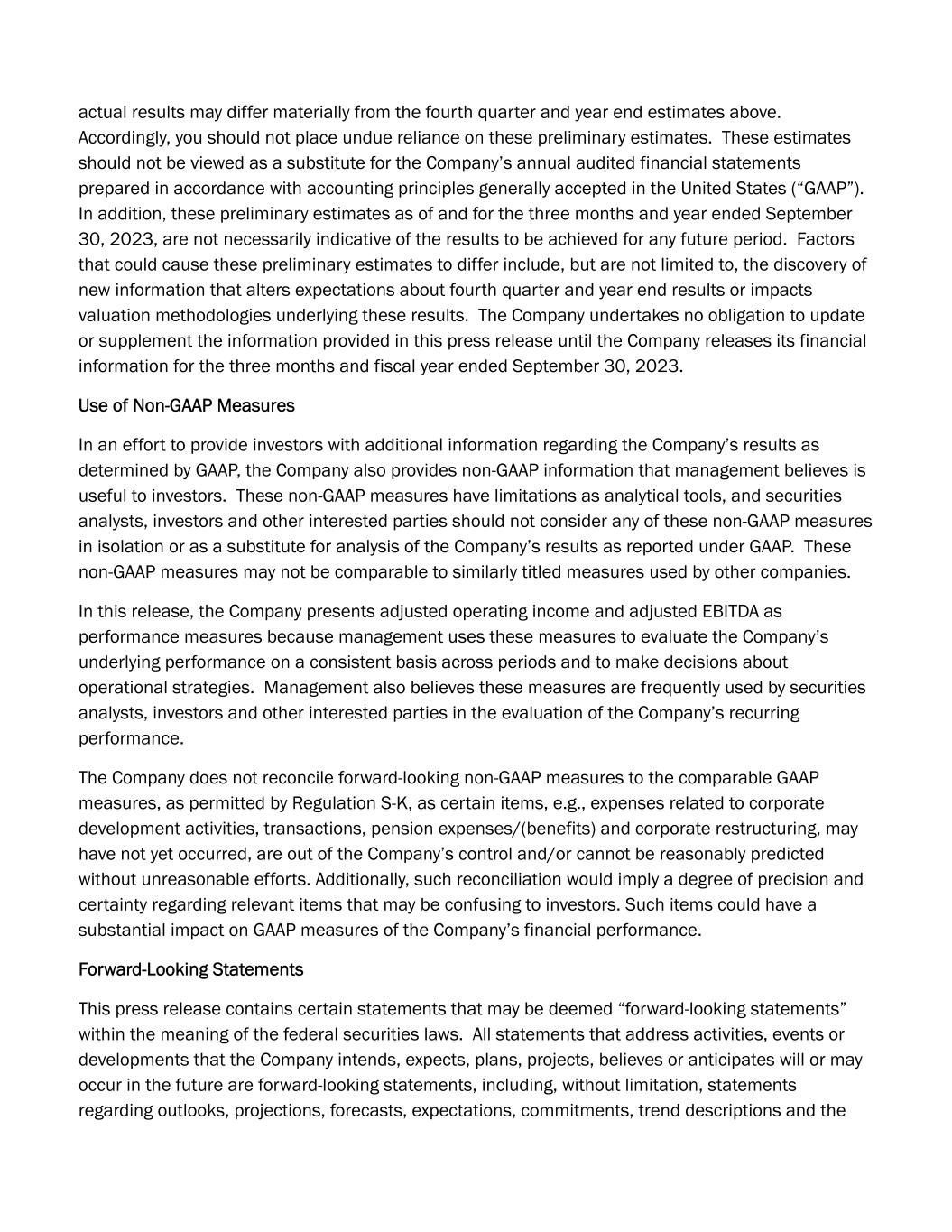 actual results may differ materially from the fourth quarter and year end estimates above. Accordingly, you should not place undue reliance on these preliminary estimates. These estimates should not be viewed as a substitute for the Company’s annual audited financial statements prepared in accordance with accounting principles generally accepted in the United States (“GAAP”). In addition, these preliminary estimates as of and for the three months and year ended September 30, 2023, are not necessarily indicative of the results to be achieved for any future period. Factors that could cause these preliminary estimates to differ include, but are not limited to, the discovery of new information that alters expectations about fourth quarter and year end results or impacts valuation methodologies underlying these results. The Company undertakes no obligation to update or supplement the information provided in this press release until the Company releases its financial information for the three months and fiscal year ended September 30, 2023. Use of Non-GAAP Measures In an effort to provide investors with additional information regarding the Company’s results as determined by GAAP, the Company also provides non-GAAP information that management believes is useful to investors. These non-GAAP measures have limitations as analytical tools, and securities analysts, investors and other interested parties should not consider any of these non-GAAP measures in isolation or as a substitute for analysis of the Company’s results as reported under GAAP. These non-GAAP measures may not be comparable to similarly titled measures used by other companies. In this release, the Company presents adjusted operating income and adjusted EBITDA as performance measures because management uses these measures to evaluate the Company’s underlying performance on a consistent basis across periods and to make decisions about operational strategies. Management also believes these measures are frequently used by securities analysts, investors and other interested parties in the evaluation of the Company’s recurring performance. The Company does not reconcile forward-looking non-GAAP measures to the comparable GAAP measures, as permitted by Regulation S-K, as certain items, e.g., expenses related to corporate development activities, transactions, pension expenses/(benefits) and corporate restructuring, may have not yet occurred, are out of the Company’s control and/or cannot be reasonably predicted without unreasonable efforts. Additionally, such reconciliation would imply a degree of precision and certainty regarding relevant items that may be confusing to investors. Such items could have a substantial impact on GAAP measures of the Company’s financial performance. Forward-Looking Statements This press release contains certain statements that may be deemed “forward-looking statements” within the meaning of the federal securities laws. All statements that address activities, events or developments that the Company intends, expects, plans, projects, believes or anticipates will or may occur in the future are forward-looking statements, including, without limitation, statements regarding outlooks, projections, forecasts, expectations, commitments, trend descriptions and the