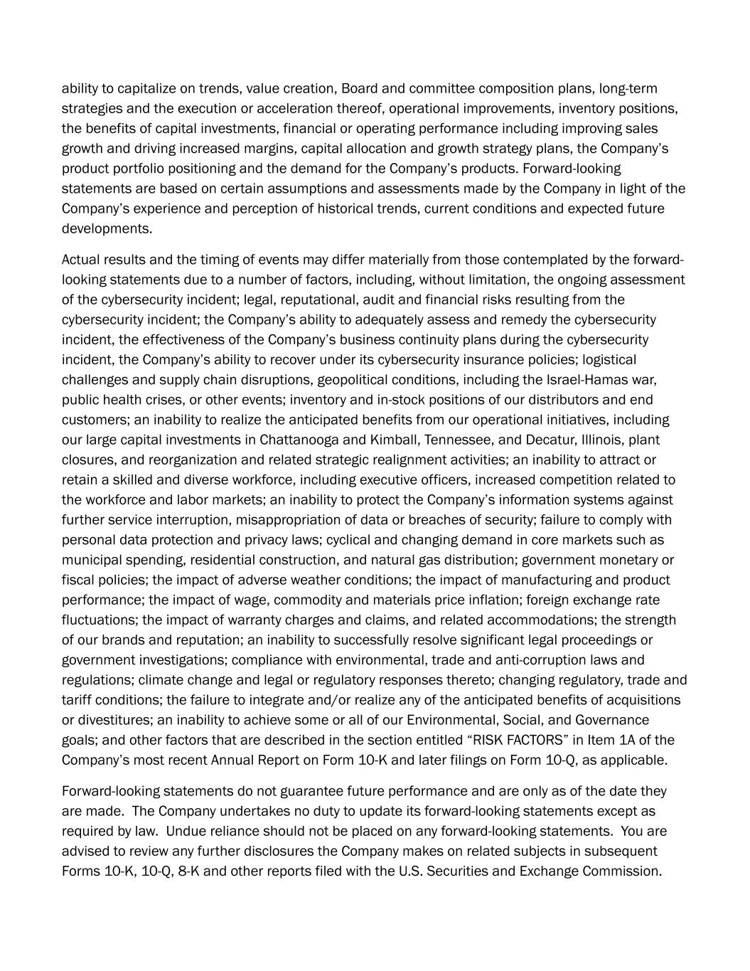 ability to capitalize on trends, value creation, Board and committee composition plans, long-term strategies and the execution or acceleration thereof, operational improvements, inventory positions, the benefits of capital investments, financial or operating performance including improving sales growth and driving increased margins, capital allocation and growth strategy plans, the Company’s product portfolio positioning and the demand for the Company’s products. Forward-looking statements are based on certain assumptions and assessments made by the Company in light of the Company’s experience and perception of historical trends, current conditions and expected future developments. Actual results and the timing of events may differ materially from those contemplated by the forward- looking statements due to a number of factors, including, without limitation, the ongoing assessment of the cybersecurity incident; legal, reputational, audit and financial risks resulting from the cybersecurity incident; the Company’s ability to adequately assess and remedy the cybersecurity incident, the effectiveness of the Company’s business continuity plans during the cybersecurity incident, the Company’s ability to recover under its cybersecurity insurance policies; logistical challenges and supply chain disruptions, geopolitical conditions, including the Israel-Hamas war, public health crises, or other events; inventory and in-stock positions of our distributors and end customers; an inability to realize the anticipated benefits from our operational initiatives, including our large capital investments in Chattanooga and Kimball, Tennessee, and Decatur, Illinois, plant closures, and reorganization and related strategic realignment activities; an inability to attract or retain a skilled and diverse workforce, including executive officers, increased competition related to the workforce and labor markets; an inability to protect the Company’s information systems against further service interruption, misappropriation of data or breaches of security; failure to comply with personal data protection and privacy laws; cyclical and changing demand in core markets such as municipal spending, residential construction, and natural gas distribution; government monetary or fiscal policies; the impact of adverse weather conditions; the impact of manufacturing and product performance; the impact of wage, commodity and materials price inflation; foreign exchange rate fluctuations; the impact of warranty charges and claims, and related accommodations; the strength of our brands and reputation; an inability to successfully resolve significant legal proceedings or government investigations; compliance with environmental, trade and anti-corruption laws and regulations; climate change and legal or regulatory responses thereto; changing regulatory, trade and tariff conditions; the failure to integrate and/or realize any of the anticipated benefits of acquisitions or divestitures; an inability to achieve some or all of our Environmental, Social, and Governance goals; and other factors that are described in the section entitled “RISK FACTORS” in Item 1A of the Company’s most recent Annual Report on Form 10-K and later filings on Form 10-Q, as applicable. Forward-looking statements do not guarantee future performance and are only as of the date they are made. The Company undertakes no duty to update its forward-looking statements except as required by law. Undue reliance should not be placed on any forward-looking statements. You are advised to review any further disclosures the Company makes on related subjects in subsequent Forms 10-K, 10-Q, 8-K and other reports filed with the U.S. Securities and Exchange Commission.