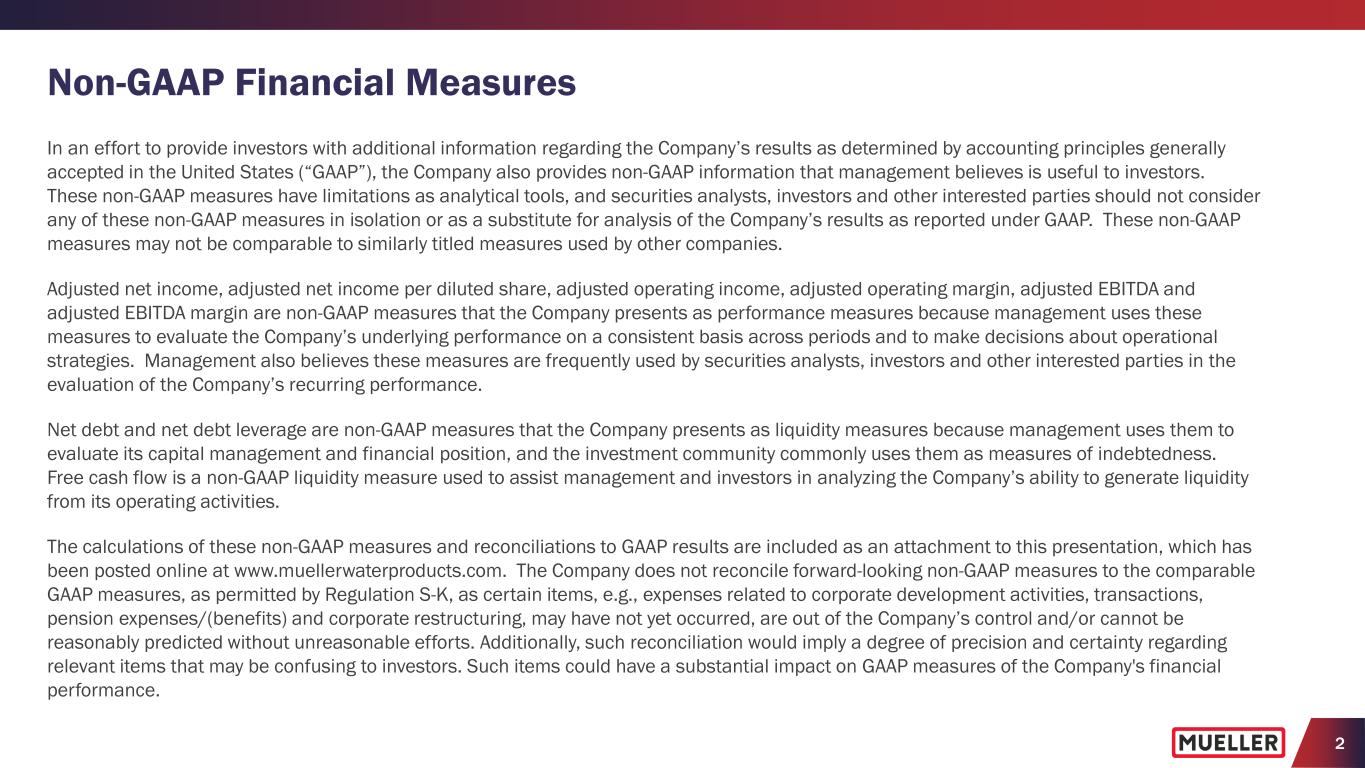 2 Non-GAAP Financial Measures In an effort to provide investors with additional information regarding the Company’s results as determined by accounting principles generally accepted in the United States (“GAAP”), the Company also provides non-GAAP information that management believes is useful to investors. These non-GAAP measures have limitations as analytical tools, and securities analysts, investors and other interested parties should not consider any of these non-GAAP measures in isolation or as a substitute for analysis of the Company’s results as reported under GAAP. These non-GAAP measures may not be comparable to similarly titled measures used by other companies. Adjusted net income, adjusted net income per diluted share, adjusted operating income, adjusted operating margin, adjusted EBITDA and adjusted EBITDA margin are non-GAAP measures that the Company presents as performance measures because management uses these measures to evaluate the Company’s underlying performance on a consistent basis across periods and to make decisions about operational strategies. Management also believes these measures are frequently used by securities analysts, investors and other interested parties in the evaluation of the Company’s recurring performance. Net debt and net debt leverage are non-GAAP measures that the Company presents as liquidity measures because management uses them to evaluate its capital management and financial position, and the investment community commonly uses them as measures of indebtedness. Free cash flow is a non-GAAP liquidity measure used to assist management and investors in analyzing the Company’s ability to generate liquidity from its operating activities. The calculations of these non-GAAP measures and reconciliations to GAAP results are included as an attachment to this presentation, which has been posted online at www.muellerwaterproducts.com. The Company does not reconcile forward-looking non-GAAP measures to the comparable GAAP measures, as permitted by Regulation S-K, as certain items, e.g., expenses related to corporate development activities, transactions, pension expenses/(benefits) and corporate restructuring, may have not yet occurred, are out of the Company’s control and/or cannot be reasonably predicted without unreasonable efforts. Additionally, such reconciliation would imply a degree of precision and certainty regarding relevant items that may be confusing to investors. Such items could have a substantial impact on GAAP measures of the Company's financial performance.