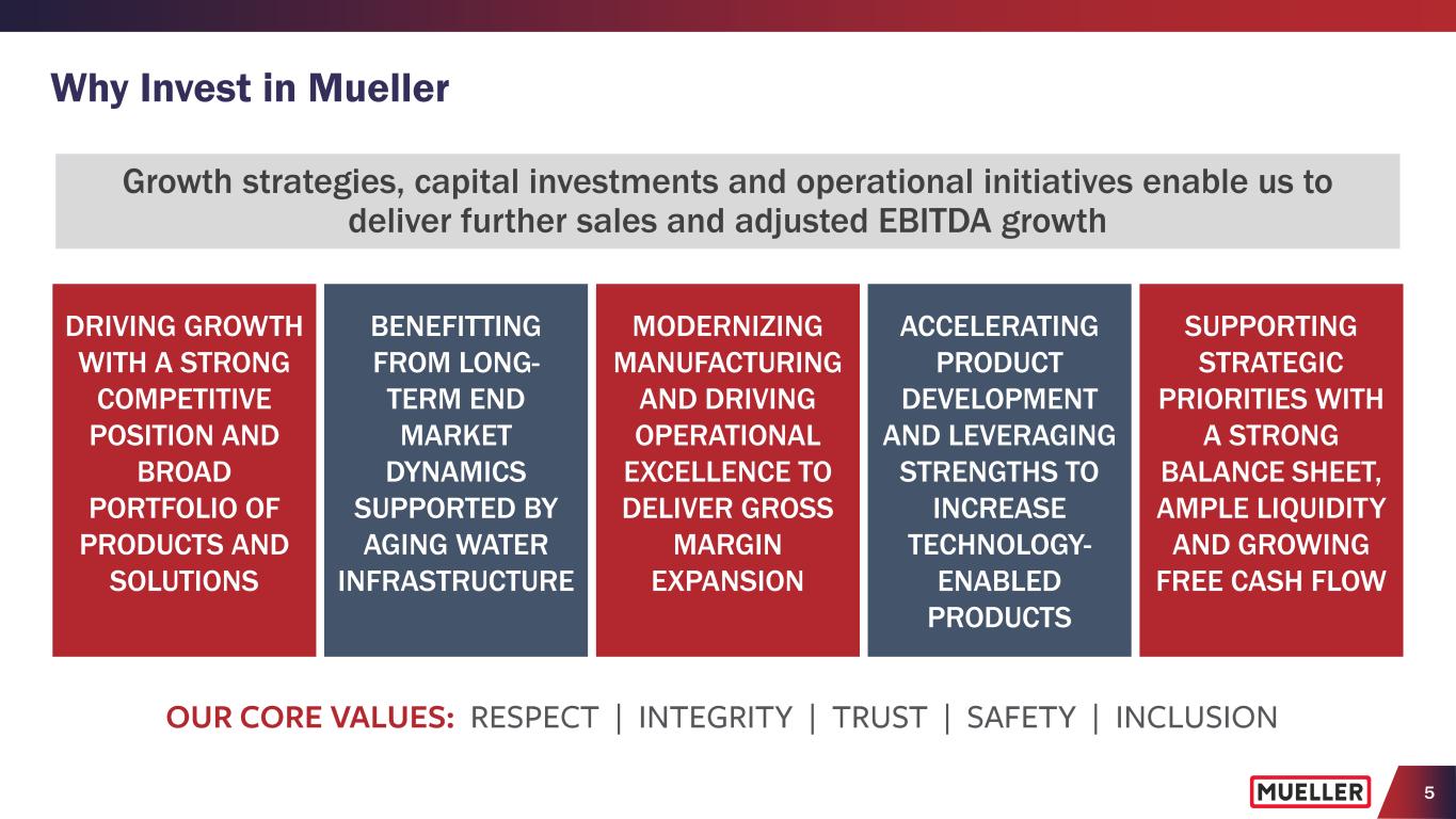 4 (1) See Appendix and SEC Filings for Segment Results and Reconciliation of Non-GAAP to GAAP Performance Measures. 5-year period includes FY19, FY20, FY21, FY22, FY23. (2) Consolidated net sales Information for geography, segments, products and end markets based on FY2023 information and estimates. (3) Water Flow Solutions includes iron gate valves, specialty valves and service brass products. Water Management Solutions includes fire hydrants, repair and installation, natural gas, metering, leak detection, pressure control and software products. (4) See Item 2. Properties in 2023 10-K filing for more information. Water Flow Solutions Water Management Solutions United States Rest of World Geography (2) (% of Consolidated Net Sales) • Founded more than 165 years ago • Spun off from Walter Industries in 2006 • Listed on NYSE (MWA) (June 2006) • Divested U.S. Pipe (April 2012) • Divested Anvil (January 2017) • Acquired Singer Valve (February 2017) • Acquired Krausz Industries (December 2018) • Acquired i20 Water (June 2021) Segments (2,3) (% of Consolidated Net Sales) ≈10% Natural gas utilities and industrial applications 60-65% Repair and replacement of municipal water infrastructure 25-30% Residential construction Brass Products Hydrants & Iron Gate Valves Specialty Valves Technology- Enabled Products (2) (% of Consolidated Net Sales) End Markets (2) (% of Consolidated Net Sales) Canada History Highlights (1) $1.22B Net Sales (LTM Q1FY24) $202.7M Adjusted EBITDA (LTM Q1FY24) 6.8% Net Sales CAGR (5-Year FY19-FY23) 16.7% Adj. EBITDA % of Net Sales (LTM Q1FY24) $550.8M Cash Flow from Operations (5-Year FY19-FY23) $231.5M Free Cash Flow (5-Year FY19-FY23) $230.7M Net Debt (Dec. 31, 2023) 1.1x Net Debt to Adj. EBITDA (Dec. 31, 2023) ≈3,200 Employees Worldwide 10 Manufacturing Facilities (4) 5 R&D Centers (4) Mueller Water Products at a Glance (NYSE: MWA) Repair Products