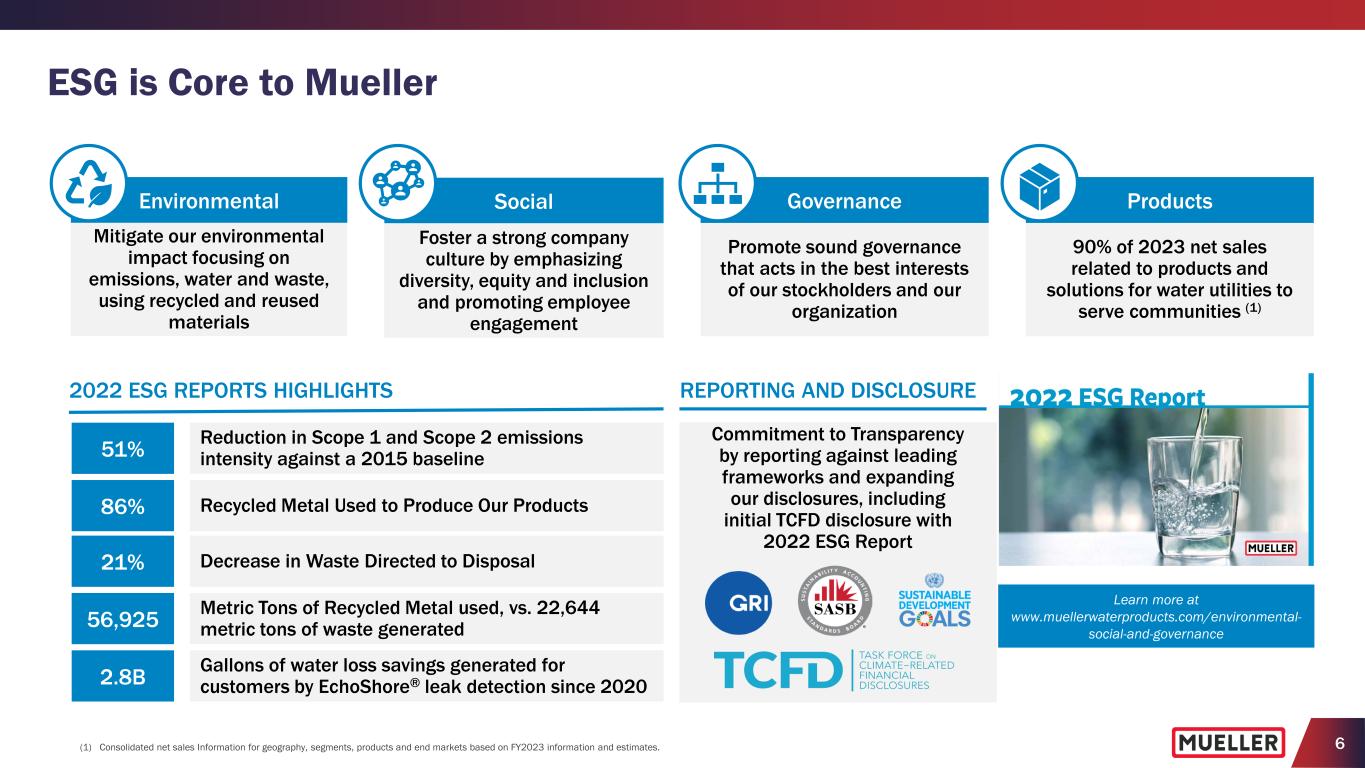 5 Why Invest in Mueller DRIVING GROWTH WITH A STRONG COMPETITIVE POSITION AND BROAD PORTFOLIO OF PRODUCTS AND SOLUTIONS BENEFITTING FROM LONG- TERM END MARKET DYNAMICS SUPPORTED BY AGING WATER INFRASTRUCTURE ACCELERATING PRODUCT DEVELOPMENT AND LEVERAGING STRENGTHS TO INCREASE TECHNOLOGY- ENABLED PRODUCTS MODERNIZING MANUFACTURING AND DRIVING OPERATIONAL EXCELLENCE TO DELIVER GROSS MARGIN EXPANSION SUPPORTING STRATEGIC PRIORITIES WITH A STRONG BALANCE SHEET, AMPLE LIQUIDITY AND GROWING FREE CASH FLOW Growth strategies, capital investments and operational initiatives enable us to deliver further sales and adjusted EBITDA growth