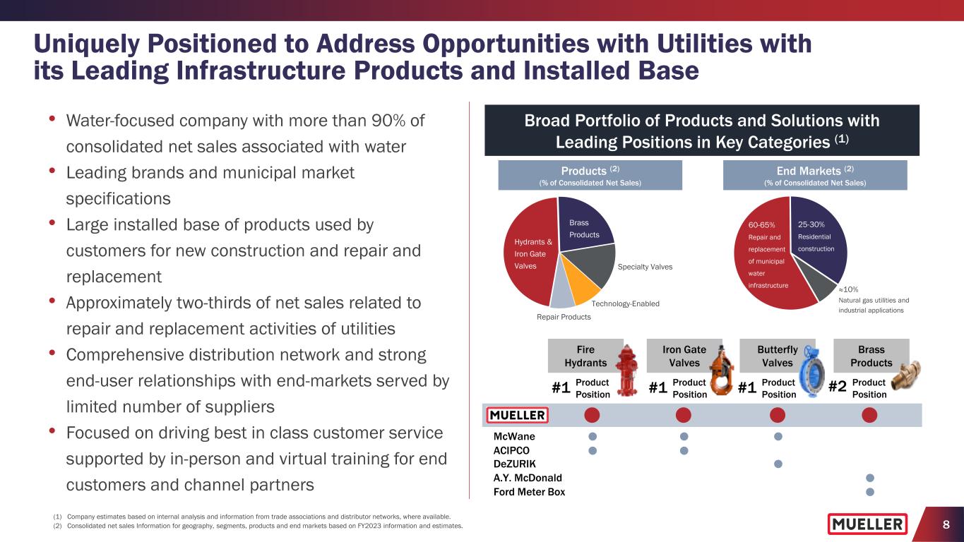 8 Leading Product Positions in Key Product Categories (1) (1) Company estimates based on internal analysis and information from trade associations and distributor networks, where available. (2) Consolidated net sales Information for geography, segments, products and end markets based on FY2023 information and estimates. Fire Hydrants Iron Gate Valves Butterfly Valves Brass Products #1 Product Position A.Y. McDonald ACIPCO DeZURIK Ford Meter Box McWane #1 Product Position #1 Product Position #2 Product Position Broad Portfolio of Products and Solutions with Leading Positions in Key Categories (1) Uniquely Positioned to Address Opportunities with Utilities with its Leading Infrastructure Products and Installed Base Products (2) (% of Consolidated Net Sales) End Markets (2) (% of Consolidated Net Sales) • Water-focused compa y with more than 90% of consolidated net sales associated with water • Leading brands and municipal market specifications • Large installed base of products used by customers for new construction and repair and replacement • Approximately two-thirds of net sales related to repair and replacement activities of utilities • Comprehensive distribution network and strong end-user relationships with end-markets served by limited number of suppliers • Focused on driving best in class customer service supported by in-person and virtual training for end customers and channel partners ≈10% Natural gas utilities and industrial applications 60-65% Repair and replacement of municipal water infrastructure 25-30% Residential construction Brass Products Hydrants & Iron Gate Valves Specialty Valves Technology-Enabled Repair Products