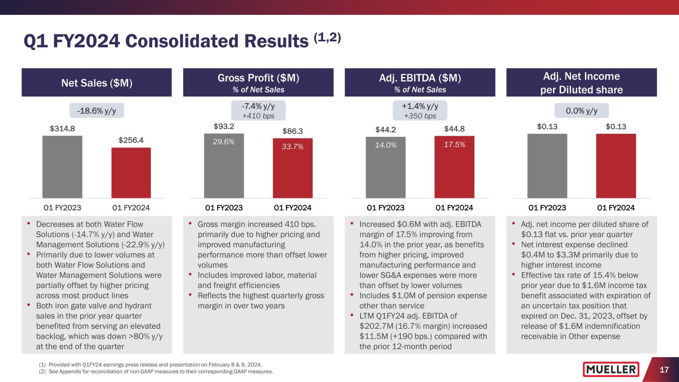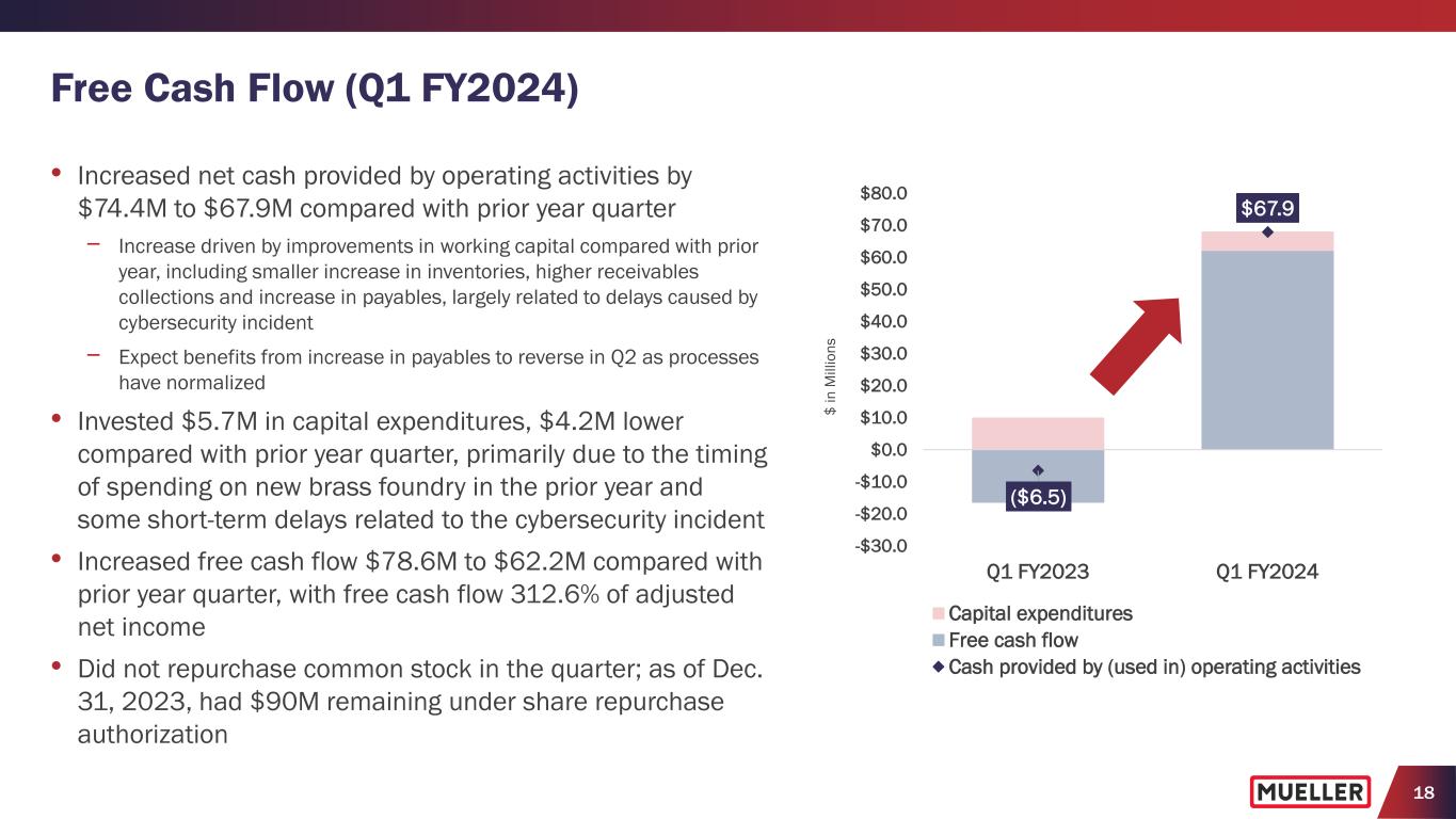 17 Q1 FY2024 Consolidated Results (1,2) (1) Provided with Q1FY24 earnings press release and presentation on February 8 & 9, 2024. (2) See Appendix for reconciliation of non-GAAP measures to their corresponding GAAP measures. • Decreases at both Water Flow Solutions (-14.7% y/y) and Water Management Solutions (-22.9% y/y) • Primarily due to lower volumes at both Water Flow Solutions and Water Management Solutions were partially offset by higher pricing across most product lines • Both iron gate valve and hydrant sales in the prior year quarter benefited from serving an elevated backlog, which was down >80% y/y at the end of the quarter • Gross margin increased 410 bps. primarily due to higher pricing and improved manufacturing performance more than offset lower volumes • Includes improved labor, material and freight efficiencies • Reflects the highest quarterly gross margin in over two years • Increased $0.6M with adj. EBITDA margin of 17.5% improving from 14.0% in the prior year, as benefits from higher pricing, improved manufacturing performance and lower SG&A expenses were more than offset by lower volumes • Includes $1.0M of pension expense other than service • LTM Q1FY24 adj. EBITDA of $202.7M (16.7% margin) increased $11.5M (+190 bps.) compared with the prior 12-month period • Adj. net income per diluted share of $0.13 flat vs. prior year quarter • Net interest expense declined $0.4M to $3.3M primarily due to higher interest income • Effective tax rate of 15.4% below prior year due to $1.6M income tax benefit associated with expiration of an uncertain tax position that expired on Dec. 31, 2023, offset by release of $1.6M indemnification receivable in Other expense Adj. EBITDA ($M) % of Net Sales $44.2 $44.8 Q1 FY2023 Q1 FY2024 +1.4% y/y +350 bps Adj. Net Income per Diluted share $0.13 $0.13 Q1 FY2023 Q1 FY2024 0.0% y/y 14.0% 17.5% Gross Profit ($M) % of Net Sales $93.2 $86.3 Q1 FY2023 Q1 FY2024 -7.4% y/y +410 bps $314.8 $256.4 Q1 FY2023 Q1 FY2024 Net Sales ($M) -18.6% y/y 33.7%29.6%
