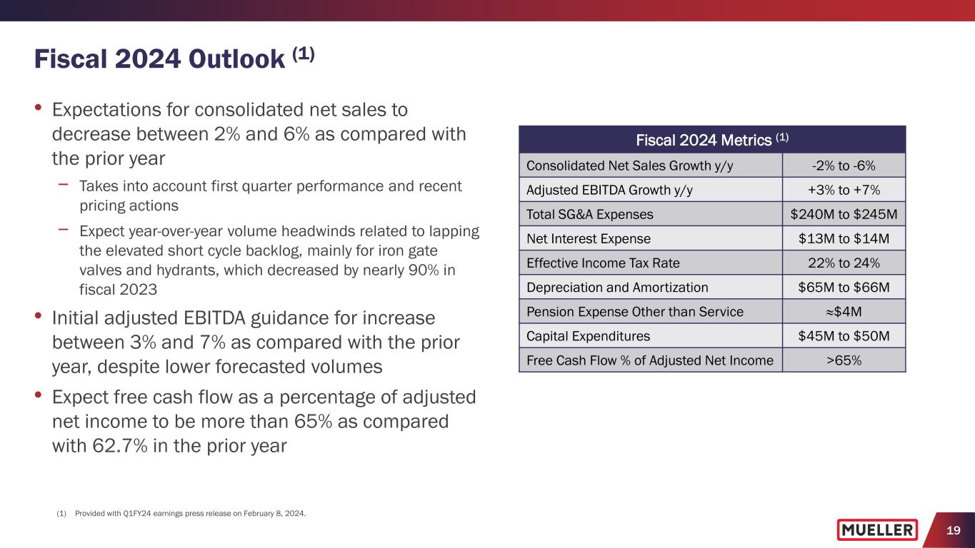 18 Free Cash Flow (Q1 FY2024) • Increased net cash provided by operating activities by $74.4M to $67.9M compared with prior year quarter − Increase driven by improvements in working capital compared with prior year, including smaller increase in inventories, higher receivables collections and increase in payables, largely related to delays caused by cybersecurity incident − Expect benefits from increase in payables to reverse in Q2 as processes have normalized • Invested $5.7M in capital expenditures, $4.2M lower compared with prior year quarter, primarily due to the timing of spending on new brass foundry in the prior year and some short-term delays related to the cybersecurity incident • Increased free cash flow $78.6M to $62.2M compared with prior year quarter, with free cash flow 312.6% of adjusted net income • Did not repurchase common stock in the quarter; as of Dec. 31, 2023, had $90M remaining under share repurchase authorization ($6.5) $67.9 -$30.0 -$20.0 -$10.0 $0.0 $10.0 $20.0 $30.0 $40.0 $50.0 $60.0 $70.0 $80.0 Q1 FY2023 Q1 FY2024 $ in M ill io ns Capital expenditures Free cash flow Cash provided by (used in) operating activities