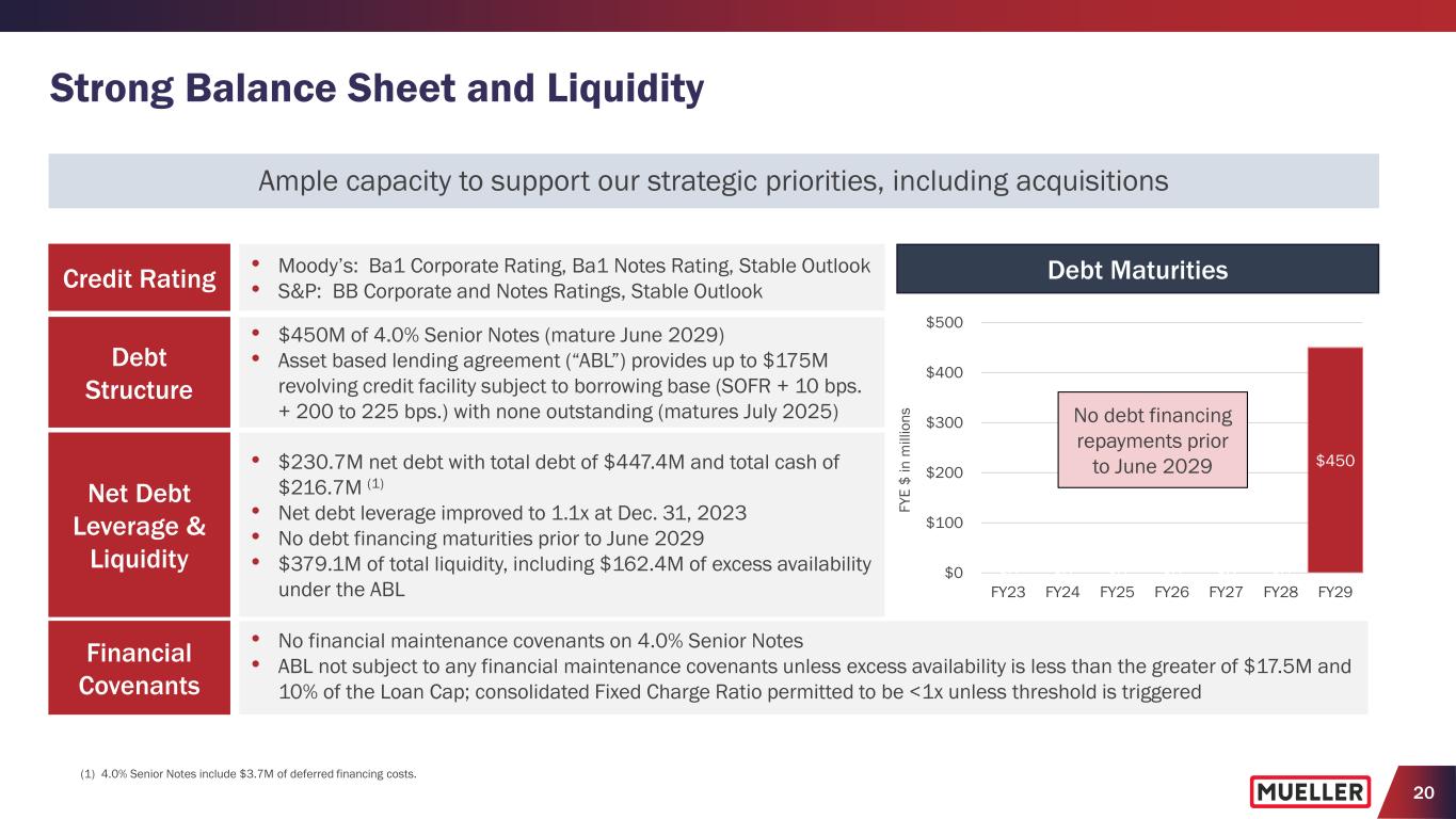19 Fiscal 2024 Outlook (1) • Expectations for consolidated net sales to decrease between 2% and 6% as compared with the prior year − Takes into account first quarter performance and recent pricing actions − Expect year-over-year volume headwinds related to lapping the elevated short cycle backlog, mainly for iron gate valves and hydrants, which decreased by nearly 90% in fiscal 2023 • Initial adjusted EBITDA guidance for increase between 3% and 7% as compared with the prior year, despite lower forecasted volumes • Expect free cash flow as a percentage of adjusted net income to be more than 65% as compared with 62.7% in the prior year (1) Provided with Q1FY24 earnings press release on February 8, 2024. Fiscal 2024 Metrics (1) Consolidated Net Sales Growth y/y -2% to -6% Adjusted EBITDA Growth y/y +3% to +7% Total SG&A Expenses $240M to $245M Net Interest Expense $13M to $14M Effective Income Tax Rate 22% to 24% Depreciation and Amortization $65M to $66M Pension Expense Other than Service ≈$4M Capital Expenditures $45M to $50M Free Cash Flow % of Adjusted Net Income >65%