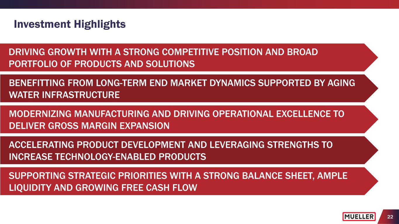 21 Balanced and Disciplined Capital Allocation • Strong balance sheet, liquidity and cash flow supporting our strategies • Maintaining balanced approach to capital allocation to strengthen and grow the business through capital investments and bolt-on acquisitions • Continuing to return cash to our shareholders, primarily through our ongoing quarterly dividend – Paid quarterly dividend since becoming a publicly- traded company – Increased quarterly dividend 8 times since FY15 – Allocated $10M to share repurchases in FY23 with $90M remaining authorization on our share repurchase program as of Dec. 31, 2023 Shareholders 33% Balance Sheet* 5% Strategic Investments* 62% $245M to Shareholders - $175M dividends - $70M share repurchases Cash Allocation Over Past 5 Years (FY19 to FY23)* $471M to Strategic Investments - $319M capital expenditures - $152M acquisitions * 5-year period includes FY19, FY20, FY21, FY22, FY23; Strategic Investments includes consolidated capital expenditures and cash paid for acquisitions of Krausz, Pratt Industrial JV and i2O Water (excludes proceeds from sales of assets); Balance Sheet includes debt retirement and pension plan payments ($2M to exit Canadian and multiemployer plans) and includes $22M payment for Walter Tax Settlement). Capital Allocation Priorities