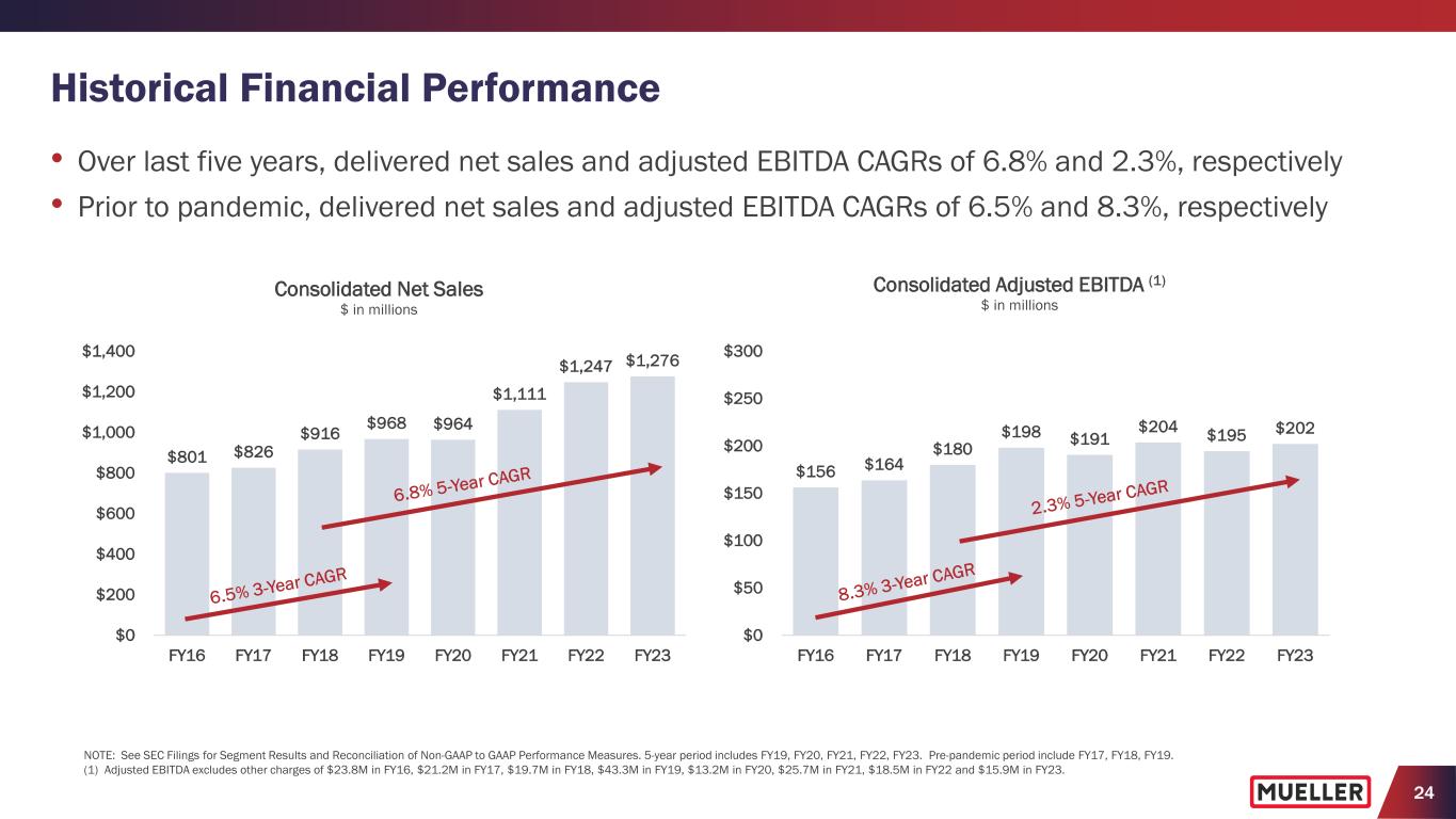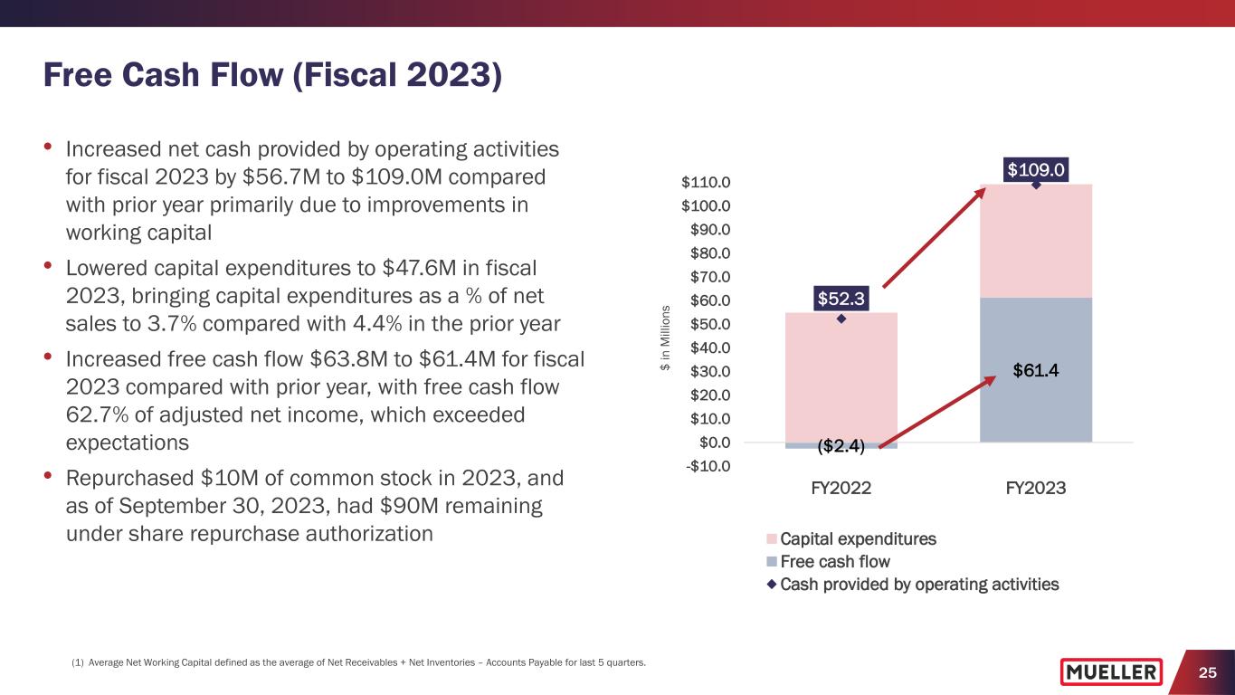 24 Historical Financial Performance • Over last five years, delivered net sales and adjusted EBITDA CAGRs of 6.8% and 2.3%, respectively • Prior to pandemic, delivered net sales and adjusted EBITDA CAGRs of 6.5% and 8.3%, respectively $801 $826 $916 $968 $964 $1,111 $1,247 $1,276 $0 $200 $400 $600 $800 $1,000 $1,200 $1,400 FY16 FY17 FY18 FY19 FY20 FY21 FY22 FY23 Consolidated Net Sales $ in millions $156 $164 $180 $198 $191 $204 $195 $202 $0 $50 $100 $150 $200 $250 $300 FY16 FY17 FY18 FY19 FY20 FY21 FY22 FY23 Consolidated Adjusted EBITDA (1) $ in millions NOTE: See SEC Filings for Segment Results and Reconciliation of Non-GAAP to GAAP Performance Measures. 5-year period includes FY19, FY20, FY21, FY22, FY23. Pre-pandemic period include FY17, FY18, FY19. (1) Adjusted EBITDA excludes other charges of $23.8M in FY16, $21.2M in FY17, $19.7M in FY18, $43.3M in FY19, $13.2M in FY20, $25.7M in FY21, $18.5M in FY22 and $15.9M in FY23.