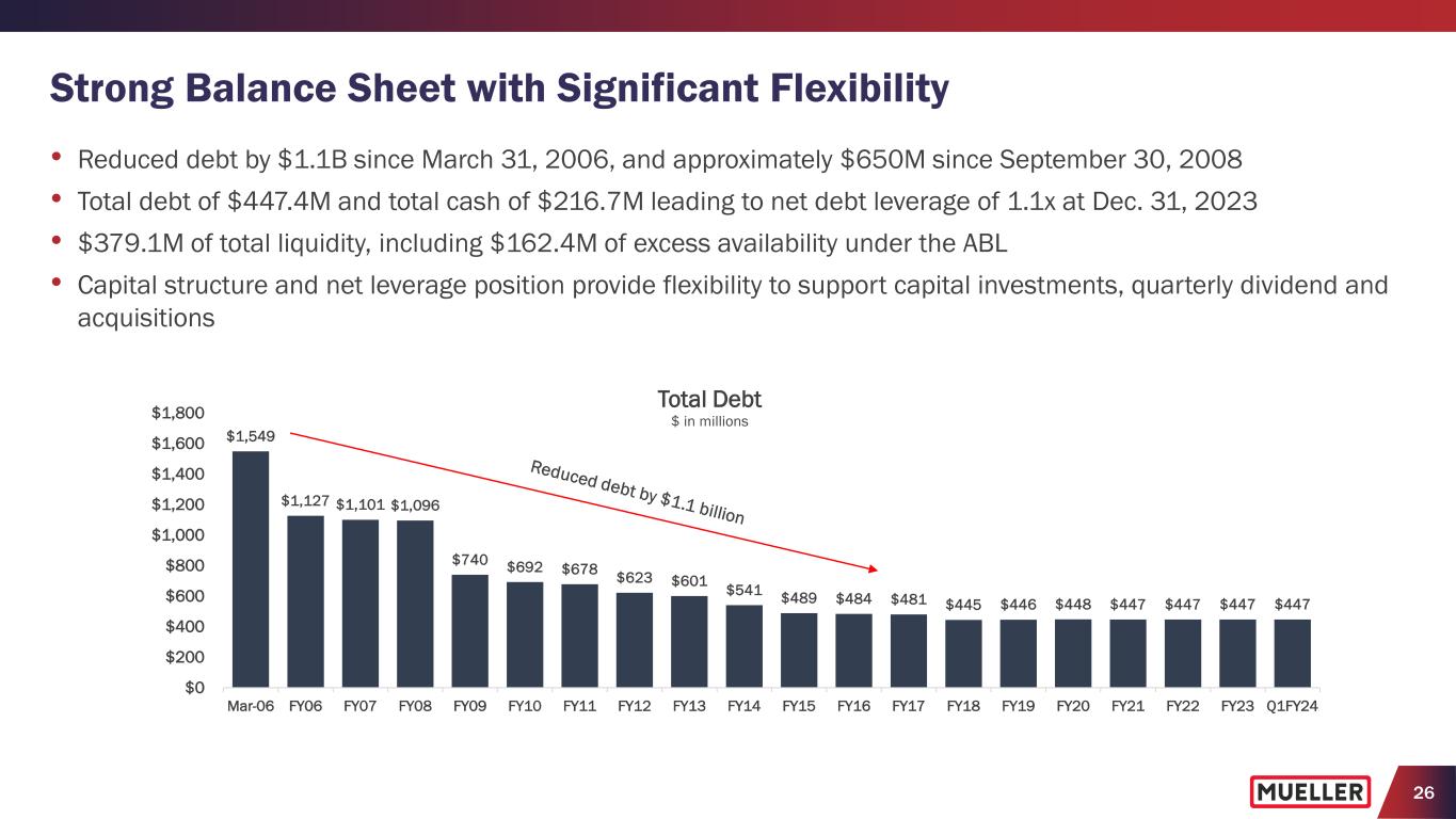 25 (1) Average Net Working Capital defined as the average of Net Receivables + Net Inventories – Accounts Payable for last 5 quarters. Free Cash Flow (Fiscal 2023) • Increased net cash provided by operating activities for fiscal 2023 by $56.7M to $109.0M compared with prior year primarily due to improvements in working capital • Lowered capital expenditures to $47.6M in fiscal 2023, bringing capital expenditures as a % of net sales to 3.7% compared with 4.4% in the prior year • Increased free cash flow $63.8M to $61.4M for fiscal 2023 compared with prior year, with free cash flow 62.7% of adjusted net income, which exceeded expectations • Repurchased $10M of common stock in 2023, and as of September 30, 2023, had $90M remaining under share repurchase authorization ($2.4) $61.4 $52.3 $109.0 -$10.0 $0.0 $10.0 $20.0 $30.0 $40.0 $50.0 $60.0 $70.0 $80.0 $90.0 $100.0 $110.0 FY2022 FY2023 $ in M ill io ns Capital expenditures Free cash flow Cash provided by operating activities