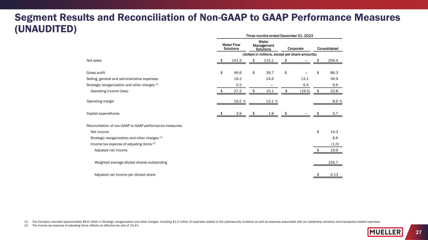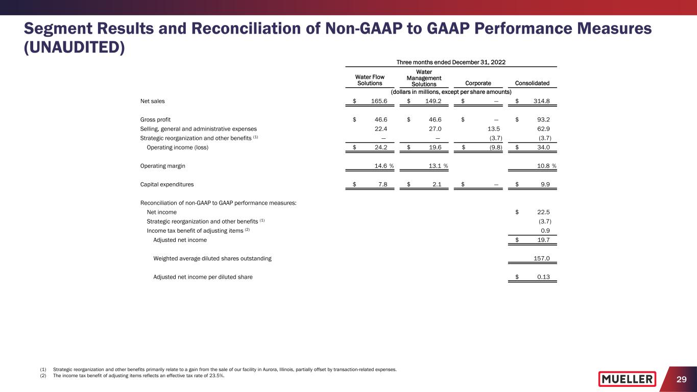 27 Segment Results and Reconciliation of Non-GAAP to GAAP Performance Measures (UNAUDITED) Three months ended December 31, 2023 Water Flow Solutions Water Management Solutions Corporate Consolidated (dollars in millions, except per share amounts) Net sales $ 141.3 $ 115.1 $ — $ 256.4 Gross profit $ 46.6 $ 39.7 $ — $ 86.3 Selling, general and administrative expenses 19.2 24.6 13.1 56.9 Strategic reorganization and other charges (1) 0.2 — 6.4 6.6 Operating income (loss) $ 27.2 $ 15.1 $ (19.5) $ 22.8 Operating margin 19.2 % 13.1 % 8.9 % Capital expenditures $ 3.9 $ 1.8 $ — $ 5.7 Reconciliation of non-GAAP to GAAP performance measures: Net income $ 14.3 Strategic reorganization and other charges (1) 6.6 Income tax expense of adjusting items (2) (1.0) Adjusted net income $ 19.9 Weighted average diluted shares outstanding 156.7 Adjusted net income per diluted share $ 0.13 (1) The Company recorded approximately $6.6 million in Strategic reorganization and other charges, including $1.5 million of expenses related to the cybersecurity incidents as well as expenses associated with our leadership transition and transaction-related expenses. (2) The income tax expense of adjusting items reflects an effective tax rate of 15.4%.