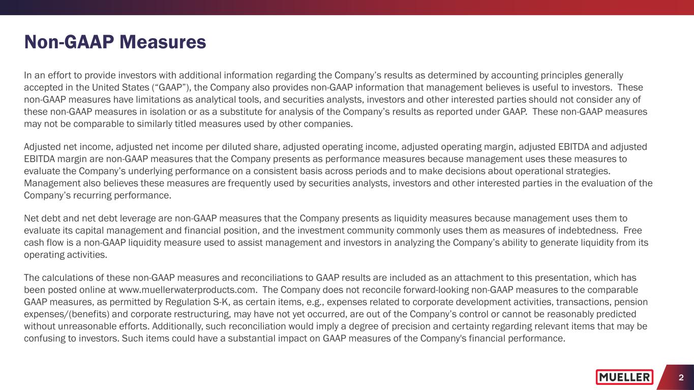2 Non-GAAP Measures In an effort to provide investors with additional information regarding the Company’s results as determined by accounting principles generally accepted in the United States (“GAAP”), the Company also provides non-GAAP information that management believes is useful to investors. These non-GAAP measures have limitations as analytical tools, and securities analysts, investors and other interested parties should not consider any of these non-GAAP measures in isolation or as a substitute for analysis of the Company’s results as reported under GAAP. These non-GAAP measures may not be comparable to similarly titled measures used by other companies. Adjusted net income, adjusted net income per diluted share, adjusted operating income, adjusted operating margin, adjusted EBITDA and adjusted EBITDA margin are non-GAAP measures that the Company presents as performance measures because management uses these measures to evaluate the Company’s underlying performance on a consistent basis across periods and to make decisions about operational strategies. Management also believes these measures are frequently used by securities analysts, investors and other interested parties in the evaluation of the Company’s recurring performance. Net debt and net debt leverage are non-GAAP measures that the Company presents as liquidity measures because management uses them to evaluate its capital management and financial position, and the investment community commonly uses them as measures of indebtedness. Free cash flow is a non-GAAP liquidity measure used to assist management and investors in analyzing the Company’s ability to generate liquidity from its operating activities. The calculations of these non-GAAP measures and reconciliations to GAAP results are included as an attachment to this presentation, which has been posted online at www.muellerwaterproducts.com. The Company does not reconcile forward-looking non-GAAP measures to the comparable GAAP measures, as permitted by Regulation S-K, as certain items, e.g., expenses related to corporate development activities, transactions, pension expenses/(benefits) and corporate restructuring, may have not yet occurred, are out of the Company’s control or cannot be reasonably predicted without unreasonable efforts. Additionally, such reconciliation would imply a degree of precision and certainty regarding relevant items that may be confusing to investors. Such items could have a substantial impact on GAAP measures of the Company's financial performance.