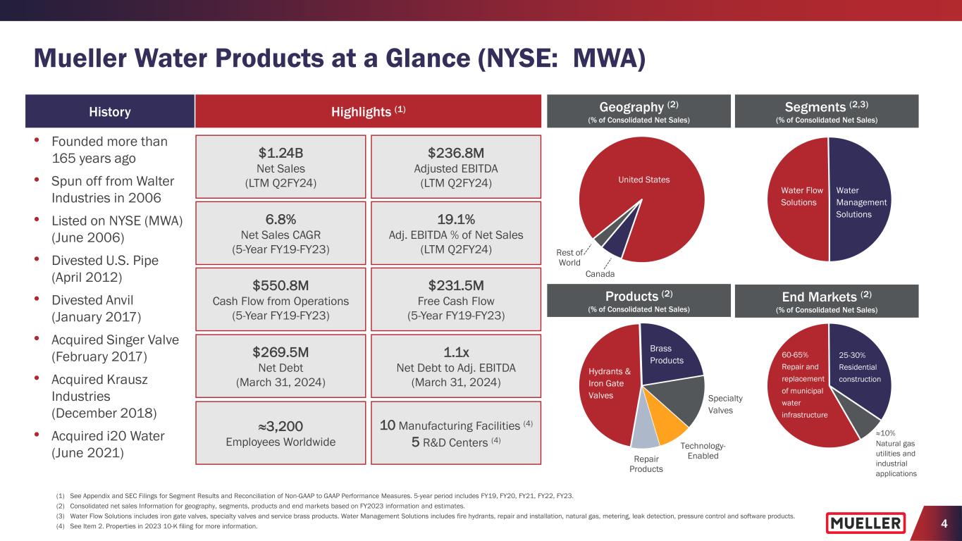 3 Forward-Looking Statements This presentation contains certain statements that may be deemed “forward-looking statements” within the meaning of the federal securities laws. All statements that address activities, events or developments that the Company intends, expects, plans, projects, believes or anticipates will or may occur in the future are forward-looking statements, including, without limitation, statements regarding outlooks, projections, forecasts, expectations, commitments, trend descriptions and the ability to capitalize on trends, value creation, Board of Directors and committee composition plans, long-term strategies and the execution or acceleration thereof, operational improvements, inventory positions, the benefits of capital investments, financial or operating performance including improving sales growth and driving increased margins, capital allocation and growth strategy plans, the Company’s product portfolio positioning and the demand for the Company’s products. Forward-looking statements are based on certain assumptions and assessments made by the Company in light of the Company’s experience and perception of historical trends, current conditions and expected future developments. Actual results and the timing of events may differ materially from those contemplated by the forward-looking statements due to a number of factors, including, without limitation, legal, reputational, audit and financial risks resulting from previously reported cybersecurity incidents and possible future cybersecurity incidents, the effectiveness of the Company’s business continuity plans related thereto, and the Company’s ability to recover under its cybersecurity insurance policies; logistical challenges and supply chain disruptions, geopolitical conditions, including the Israel-Hamas war, public health crises, or other events; inventory and in-stock positions of our distributors and end customers; an inability to realize the anticipated benefits from our operational initiatives, including our large capital investments in Chattanooga and Kimball, Tennessee, and Decatur, Illinois, plant closures, and reorganization and related strategic realignment activities; an inability to attract or retain a skilled and diverse workforce, including executive officers, increased competition related to the workforce and labor markets; an inability to protect the Company’s information systems against further service interruption, misappropriation of data or breaches of security; failure to comply with personal data protection and privacy laws; cyclical and changing demand in core markets such as municipal spending, residential construction, and natural gas distribution; government monetary or fiscal policies; the impact of adverse weather conditions; the impact of manufacturing and product performance; the impact of wage, commodity and materials price inflation; foreign exchange rate fluctuations; the impact of higher interest rates; the impact of warranty charges and claims, and related accommodations; the strength of our brands and reputation; an inability to successfully resolve significant legal proceedings or government investigations; compliance with environmental, trade and anti-corruption laws and regulations; climate change and legal or regulatory responses thereto; changing regulatory, trade and tariff conditions; the failure to integrate and/or realize any of the anticipated benefits of acquisitions or divestitures; an inability to achieve some or all of our Environmental, Social and Governance goals; and other factors that are described in the section entitled “RISK FACTORS” in Item 1A of the Company’s most recent Annual Report on Form 10-K and later filings on Form 10-Q, as applicable. Forward-looking statements do not guarantee future performance and are only as of the date they are made. The Company undertakes no duty to update its forward- looking statements except as required by law. Undue reliance should not be placed on any forward-looking statements. You are advised to review any further disclosures the Company makes on related subjects in subsequent Forms 10-K, 10-Q, 8-K and other reports filed with the U.S. Securities and Exchange Commission.