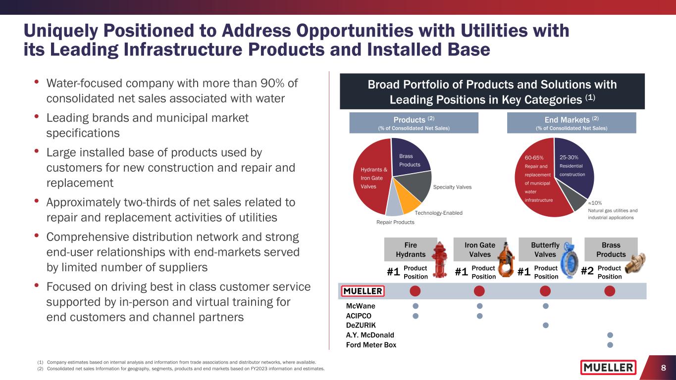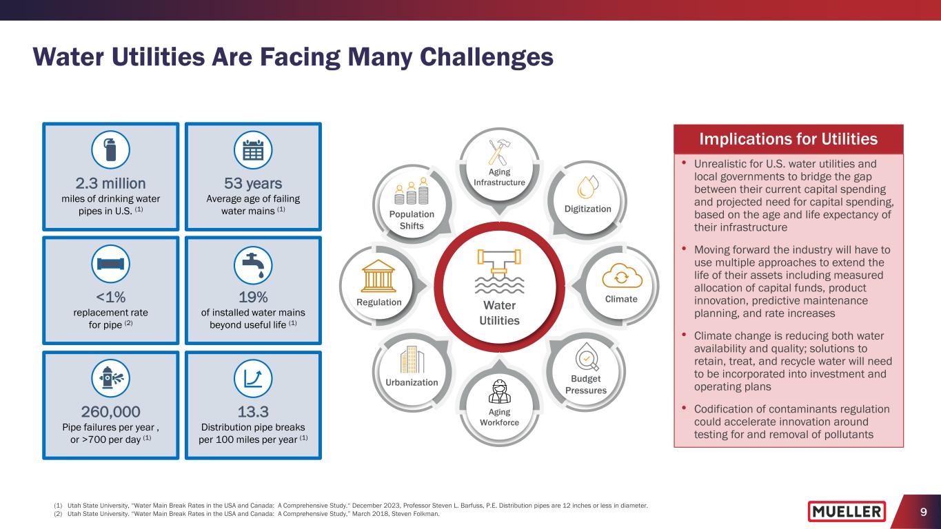 8 Leading Product Positions in Key Product Categories (1) (1) Company estimates based on internal analysis and information from trade associations and distributor networks, where available. (2) Consolidated net sales Information for geography, segments, products and end markets based on FY2023 information and estimates. Fire Hydrants Iron Gate Valves Butterfly Valves Brass Products #1 Product Position A.Y. McDonald ACIPCO DeZURIK Ford Meter Box McWane #1 Product Position #1 Product Position #2 Product Position Broad Portfolio of Products and Solutions with Leading Positions in Key Categories (1) Uniquely Positioned to Address Opportunities with Utilities with its Leading Infrastructure Products and Installed Base Products (2) (% of Consolidated Net Sales) End Markets (2) (% of Consolidated Net Sales) • Water-focused company with more than 90% of consolidated net sales associated with water • Leading brands and municipal market specifications • Large installed base of products used by customers for new construction and repair and replacement • Approximately two-thirds of net sales related to repair and replacement activities of utilities • Comprehensive distribution network and strong end-user relationships with end-markets served by limited number of suppliers • Focused on driving best in class customer service supported by in-person and virtual training for end customers and channel partners ≈10% Natural gas utilities and industrial applications 60-65% Repair and replacement of municipal water infrastructure 25-30% Residential construction Brass Products Hydrants & Iron Gate Valves Specialty Valves Technology-Enabled Repair Products