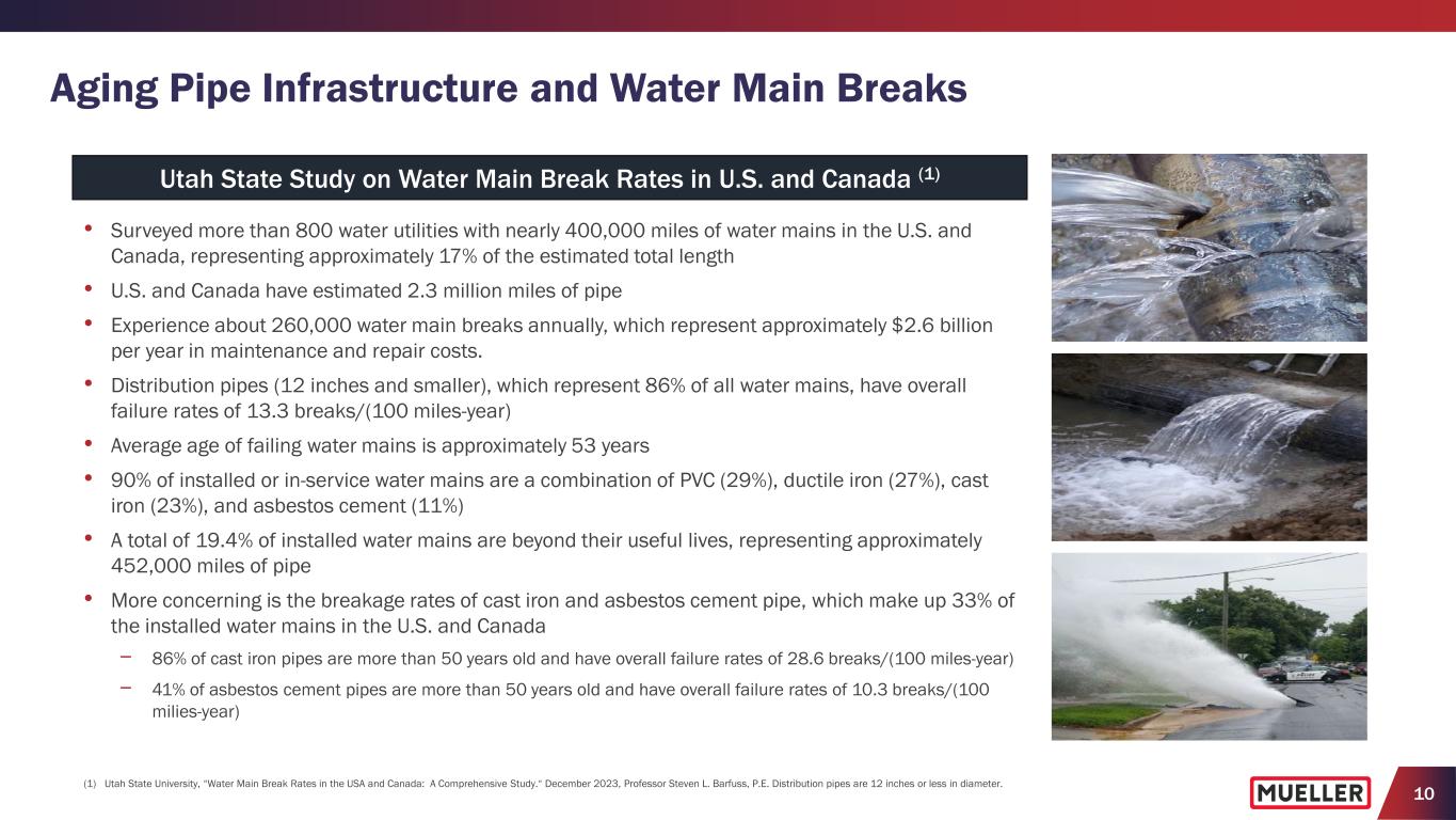 9 Water Utilities Are Facing Many Challenges • Unrealistic for U.S. water utilities and local governments to bridge the gap between their current capital spending and projected need for capital spending, based on the age and life expectancy of their infrastructure • Moving forward the industry will have to use multiple approaches to extend the life of their assets including measured allocation of capital funds, product innovation, predictive maintenance planning, and rate increases • Climate change is reducing both water availability and quality; solutions to retain, treat, and recycle water will need to be incorporated into investment and operating plans • Codification of contaminants regulation could accelerate innovation around testing for and removal of pollutants Aging Infrastructure Digitization Budget Pressures Aging Workforce Urbanization Population Shifts Water Utilities Implications for Utilities Regulation Climate 13.3 Distribution pipe breaks per 100 miles per year (1) <1% replacement rate for pipe (2) 2.3 million miles of drinking water pipes in U.S. (1) 19% of installed water mains beyond useful life (1) 53 years Average age of failing water mains (1) 260,000 Pipe failures per year , or >700 per day (1) (1) Utah State University, “Water Main Break Rates in the USA and Canada: A Comprehensive Study.“ December 2023, Professor Steven L. Barfuss, P.E. Distribution pipes are 12 inches or less in diameter. (2) Utah State University. “Water Main Break Rates in the USA and Canada: A Comprehensive Study,” March 2018, Steven Folkman.