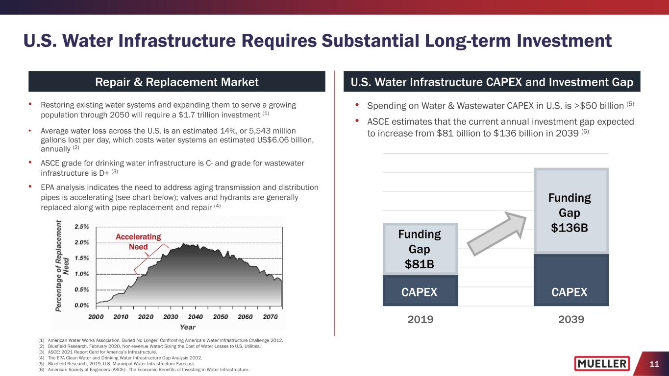 11 U.S. Water Infrastructure Requires Substantial Long-term Investment U.S. Water Infrastructure CAPEX and Investment GapRepair & Replacement Market (1) American Water Works Association, Buried No Longer: Confronting America’s Water Infrastructure Challenge 2012. (2) Bluefield Research, February 2020, Non-revenue Water: Sizing the Cost of Water Losses to U.S. Utilities. (3) ASCE: 2021 Report Card for America’s Infrastructure. (4) The EPA Clean Water and Drinking Water Infrastructure Gap Analysis 2002. (5) Bluefield Research, 2019, U.S. Municipal Water Infrastructure Forecast. (6) American Society of Engineers (ASCE): The Economic Benefits of Investing in Water Infrastructure. • Restoring existing water systems and expanding them to serve a growing population through 2050 will require a $1.7 trillion investment (1) • Average water loss across the U.S. is an estimated 14%, or 5,543 million gallons lost per day, which costs water systems an estimated US$6.06 billion, annually (2) • ASCE grade for drinking water infrastructure is C- and grade for wastewater infrastructure is D+ (3) • EPA analysis indicates the need to address aging transmission and distribution pipes is accelerating (see chart below); valves and hydrants are generally replaced along with pipe replacement and repair (4) 2019 2039 • Spending on Water & Wastewater CAPEX in U.S. is >$50 billion (5) • ASCE estimates that the current annual investment gap expected to increase from $81 billion to $136 billion in 2039 (6) Accelerating Need Funding Gap $81B Funding Gap $136B CAPEX CAPEX