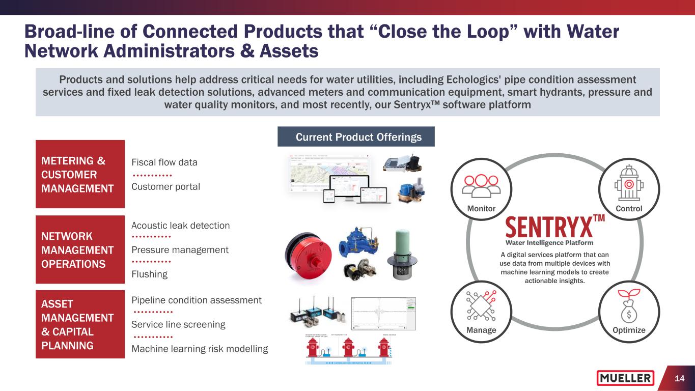 13 Need for More Digital Products and Solutions Expected to Accelerate Climate, Population Shifts, Urbanization and Water Scarcity • Aging workforce and anticipated retirements rated as one of the top challenges facing utilities projected to see significant retirements over the next ten years (7) • Increasing consumer awareness and demand for water quality and usage information • Double-digit growth expected for emerging IoT and analytics solutions in areas like optimization, data integration, and strategic asset management (1) (1) Bluefield Research, June 2022, “The Digital Water Revolution: Global Digital Water Market Forecast, 2022 - 2030.” (2) Bluefield Research, 2019, Water Industry 4.0 Focus Report. (3) Utah State University, “Water Main Break Rates in the USA and Canada: A Comprehensive Study.“ December 2023, Professor Steven L. Barfuss, P.E. Distribution pipes are 12 inches or less in diameter. (4) Bluefield Research, February 2022, “U.S. Water & Sewer Pipe Network Infrastructure: Market Trends and Forecasts, 2022 – 2030.” (5) National Resource Defense Council. (6) U.S. Drought Monitor as of April 30, 2024 (includes contiguous 48 states). (7) American Water Works Association, “2022 State of the Water Industry Report.” • Increased frequency of extreme climate events elevating importance of infrastructure resiliency and water management with 37% of U.S. experiencing drought or abnormally dry conditions (6) • Population growth and migration trends leading to increased demand in suburban/rural areas (1) • Water scarcity awareness has increased conservation and use of low-flow appliances pressuring utility budgets, however additional resources will be needed to meet demand Aging Workforce, Consumer Awareness and Digitization Aging Infrastructure and Non-Revenue Water • Average age of water pipes has increased to 45 years in 2020 from 25 years in 1970 (2) • 260,000 water main breaks per year with distribution pipes (3) • Estimated U.S. water utilities lose 5.5 billion gallons of drinking water per day due to pipe leaks and main breaks (4) • Growing number of states requiring water loss audits (6) “Bluefield projects that total global digital water spend will scale at an 8.8% CAGR through 2030 with approximately 25% of total global digital water spend in the U.S.” (1) Bluefield Research, June 2022