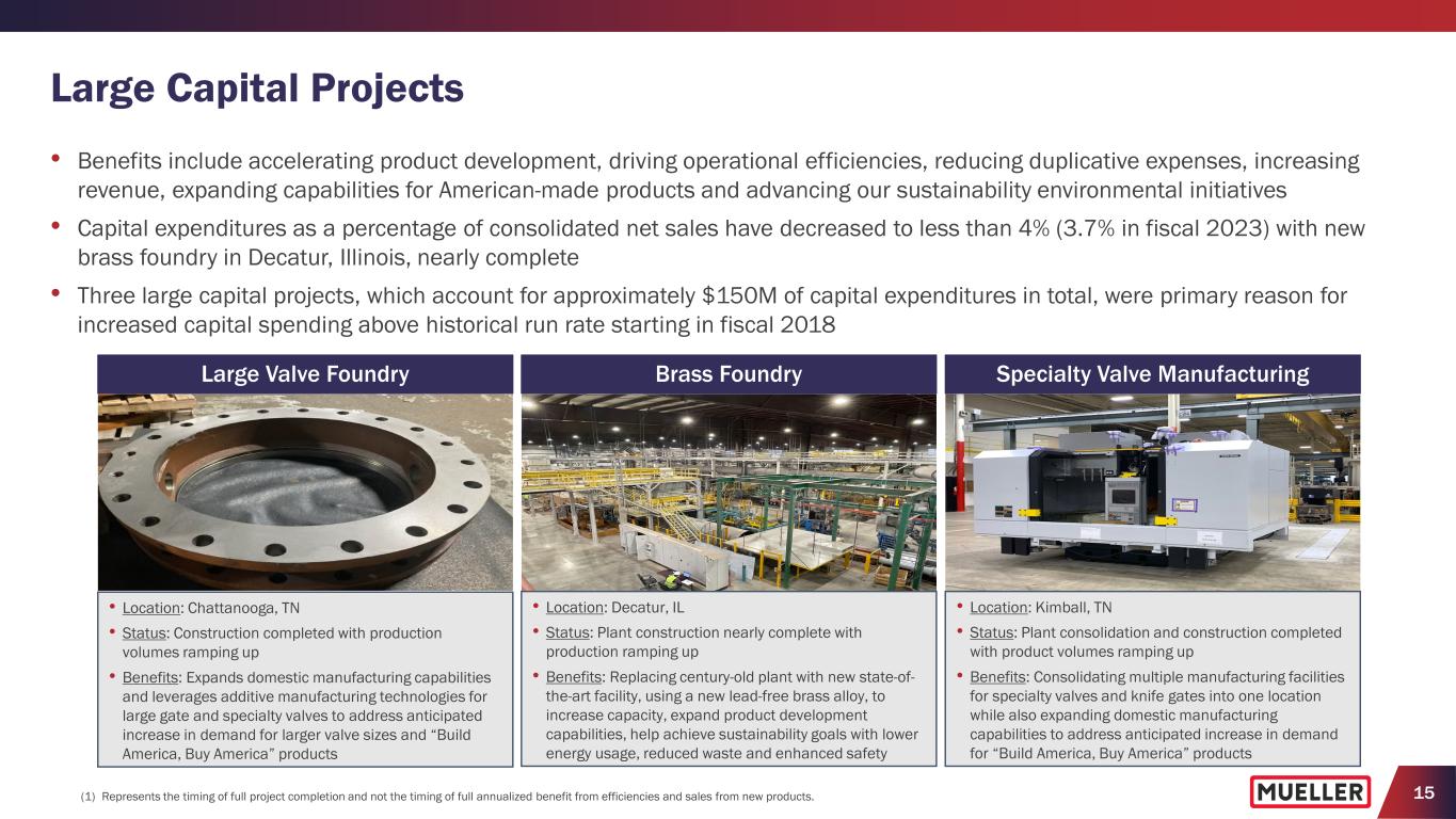 15 Large Capital Projects Large Valve Foundry Brass Foundry Specialty Valve Manufacturing • Benefits include accelerating product development, driving operational efficiencies, reducing duplicative expenses, increasing revenue, expanding capabilities for American-made products and advancing our sustainability environmental initiatives • Capital expenditures as a percentage of consolidated net sales have decreased to less than 4% (3.7% in fiscal 2023) with new brass foundry in Decatur, Illinois, nearly complete • Three large capital projects, which account for approximately $150M of capital expenditures in total, were primary reason for increased capital spending above historical run rate starting in fiscal 2018 • Location: Chattanooga, TN • Status: Construction completed with production volumes ramping up • Benefits: Expands domestic manufacturing capabilities and leverages additive manufacturing technologies for large gate and specialty valves to address anticipated increase in demand for larger valve sizes and “Build America, Buy America” products • Location: Decatur, IL • Status: Plant construction nearly complete with production ramping up • Benefits: Replacing century-old plant with new state-of- the-art facility, using a new lead-free brass alloy, to increase capacity, expand product development capabilities, help achieve sustainability goals with lower energy usage, reduced waste and enhanced safety • Location: Kimball, TN • Status: Plant consolidation and construction completed with product volumes ramping up • Benefits: Consolidating multiple manufacturing facilities for specialty valves and knife gates into one location while also expanding domestic manufacturing capabilities to address anticipated increase in demand for “Build America, Buy America” products (1) Represents the timing of full project completion and not the timing of full annualized benefit from efficiencies and sales from new products.