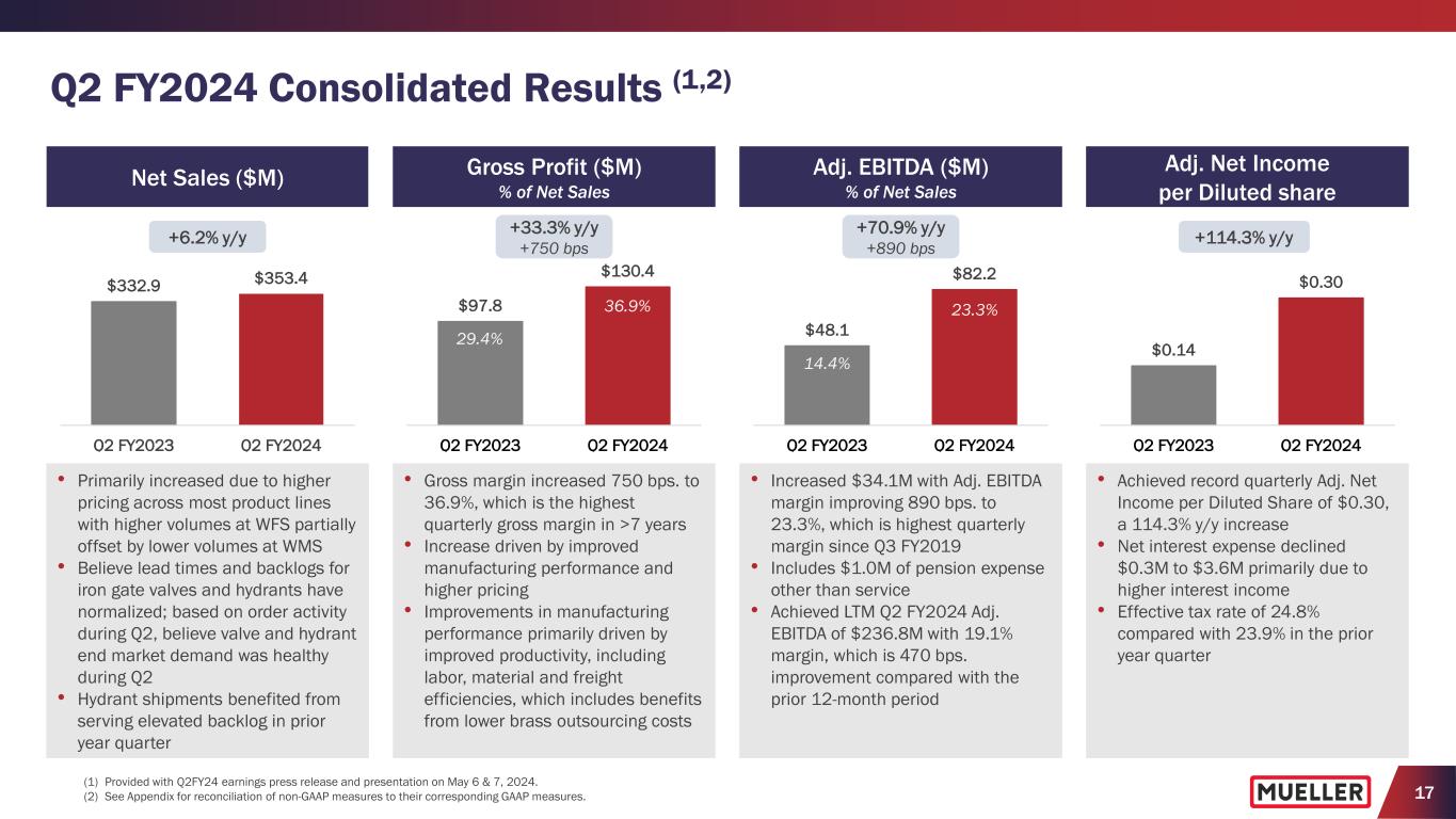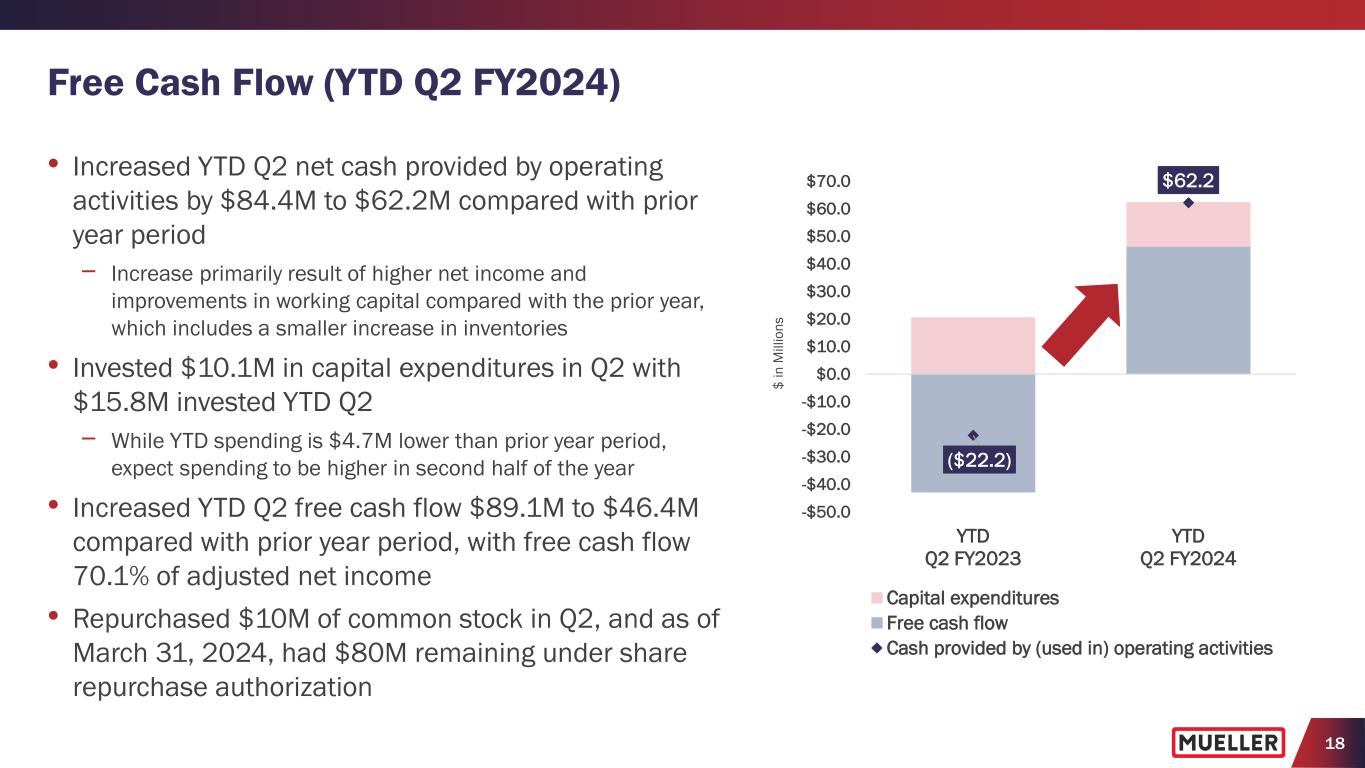 17 Q2 FY2024 Consolidated Results (1,2) (1) Provided with Q2FY24 earnings press release and presentation on May 6 & 7, 2024. (2) See Appendix for reconciliation of non-GAAP measures to their corresponding GAAP measures. • Primarily increased due to higher pricing across most product lines with higher volumes at WFS partially offset by lower volumes at WMS • Believe lead times and backlogs for iron gate valves and hydrants have normalized; based on order activity during Q2, believe valve and hydrant end market demand was healthy during Q2 • Hydrant shipments benefited from serving elevated backlog in prior year quarter • Gross margin increased 750 bps. to 36.9%, which is the highest quarterly gross margin in >7 years • Increase driven by improved manufacturing performance and higher pricing • Improvements in manufacturing performance primarily driven by improved productivity, including labor, material and freight efficiencies, which includes benefits from lower brass outsourcing costs • Increased $34.1M with Adj. EBITDA margin improving 890 bps. to 23.3%, which is highest quarterly margin since Q3 FY2019 • Includes $1.0M of pension expense other than service • Achieved LTM Q2 FY2024 Adj. EBITDA of $236.8M with 19.1% margin, which is 470 bps. improvement compared with the prior 12-month period • Achieved record quarterly Adj. Net Income per Diluted Share of $0.30, a 114.3% y/y increase • Net interest expense declined $0.3M to $3.6M primarily due to higher interest income • Effective tax rate of 24.8% compared with 23.9% in the prior year quarter Adj. EBITDA ($M) % of Net Sales $48.1 $82.2 Q2 FY2023 Q2 FY2024 +70.9% y/y +890 bps Adj. Net Income per Diluted share $0.14 $0.30 Q2 FY2023 Q2 FY2024 +114.3% y/y 14.4% 23.3% Gross Profit ($M) % of Net Sales $97.8 $130.4 Q2 FY2023 Q2 FY2024 +33.3% y/y +750 bps $332.9 $353.4 Q2 FY2023 Q2 FY2024 Net Sales ($M) +6.2% y/y 36.9% 29.4%