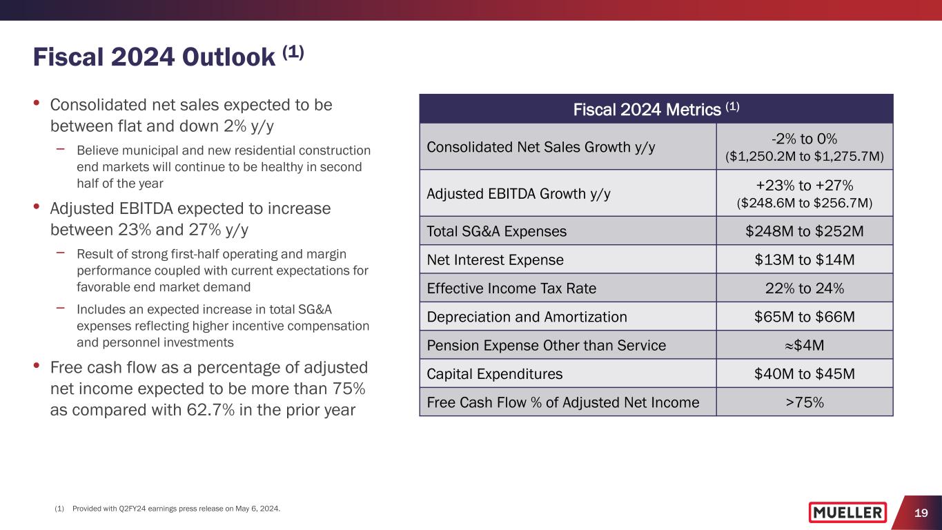 18 Free Cash Flow (YTD Q2 FY2024) • Increased YTD Q2 net cash provided by operating activities by $84.4M to $62.2M compared with prior year period − Increase primarily result of higher net income and improvements in working capital compared with the prior year, which includes a smaller increase in inventories • Invested $10.1M in capital expenditures in Q2 with $15.8M invested YTD Q2 − While YTD spending is $4.7M lower than prior year period, expect spending to be higher in second half of the year • Increased YTD Q2 free cash flow $89.1M to $46.4M compared with prior year period, with free cash flow 70.1% of adjusted net income • Repurchased $10M of common stock in Q2, and as of March 31, 2024, had $80M remaining under share repurchase authorization ($22.2) $62.2 -$50.0 -$40.0 -$30.0 -$20.0 -$10.0 $0.0 $10.0 $20.0 $30.0 $40.0 $50.0 $60.0 $70.0 YTD Q2 FY2023 YTD Q2 FY2024 $ in M ill io ns Capital expenditures Free cash flow Cash provided by (used in) operating activities