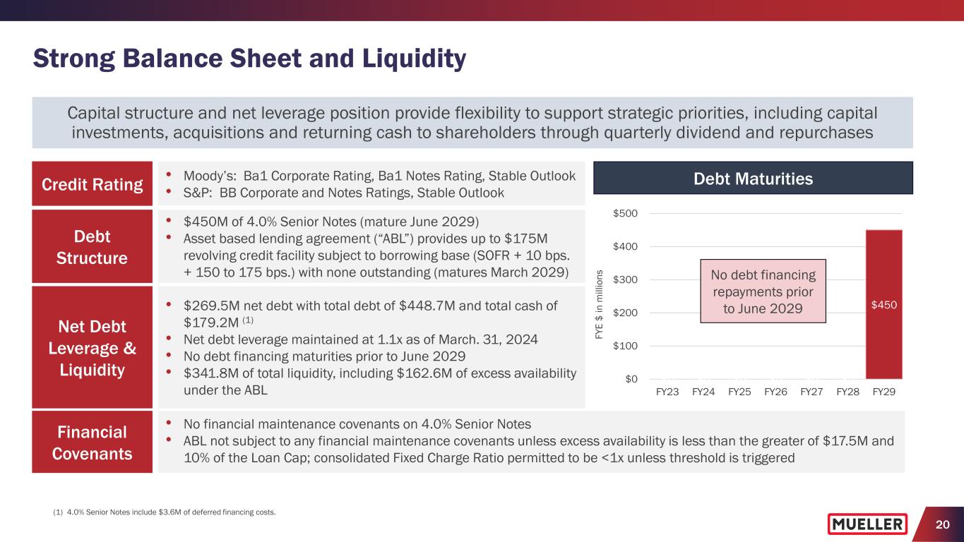 19 Fiscal 2024 Outlook (1) • Consolidated net sales expected to be between flat and down 2% y/y − Believe municipal and new residential construction end markets will continue to be healthy in second half of the year • Adjusted EBITDA expected to increase between 23% and 27% y/y − Result of strong first-half operating and margin performance coupled with current expectations for favorable end market demand − Includes an expected increase in total SG&A expenses reflecting higher incentive compensation and personnel investments • Free cash flow as a percentage of adjusted net income expected to be more than 75% as compared with 62.7% in the prior year (1) Provided with Q2FY24 earnings press release on May 6, 2024. Fiscal 2024 Metrics (1) Consolidated Net Sales Growth y/y -2% to 0% ($1,250.2M to $1,275.7M) Adjusted EBITDA Growth y/y +23% to +27% ($248.6M to $256.7M) Total SG&A Expenses $248M to $252M Net Interest Expense $13M to $14M Effective Income Tax Rate 22% to 24% Depreciation and Amortization $65M to $66M Pension Expense Other than Service ≈$4M Capital Expenditures $40M to $45M Free Cash Flow % of Adjusted Net Income >75%
