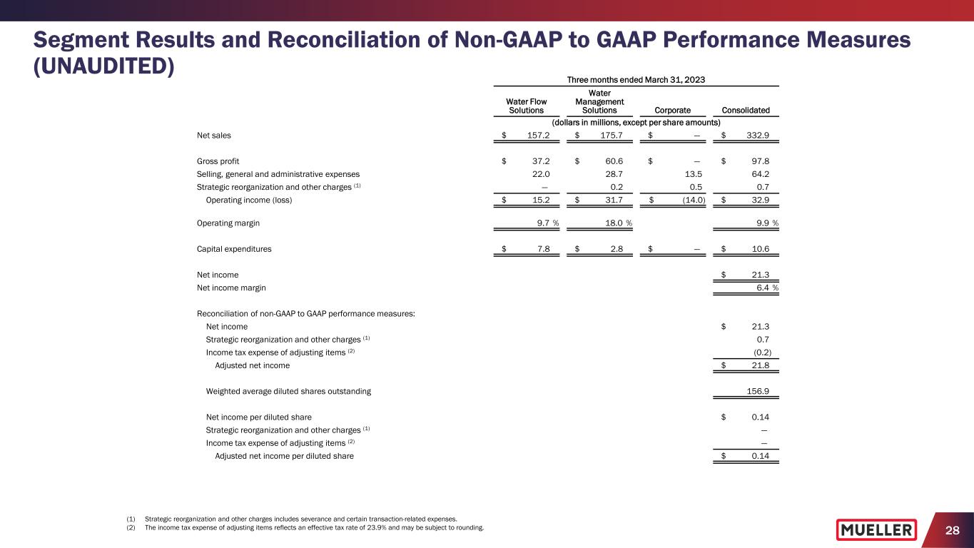 27 Segment Results and Reconciliation of Non-GAAP to GAAP Performance Measures (UNAUDITED) Three months ended March 31, 2024 Water Flow Solutions Water Management Solutions Corporate Consolidated (dollars in millions, except per share amounts) Net income $ 44.3 Income tax expense (3) 14.6 Interest expense, net (3) 3.6 Pension expense other than service (3) 1.0 Operating income (loss) $ 52.6 $ 29.0 $ (18.1) 63.5 Strategic reorganization and other charges (1) — — 3.2 3.2 Adjusted operating income (loss) 52.6 29.0 (14.9) 66.7 Pension expense other than service — — (1.0) (1.0) Depreciation and amortization 9.8 6.7 — 16.5 Adjusted EBITDA $ 62.4 $ 35.7 $ (15.9) $ 82.2 Adjusted operating margin 25.6 % 19.6 % 18.9 % Adjusted EBITDA margin 30.3 % 24.2 % 23.3 % Adjusted EBITDA $ 62.4 $ 35.7 $ (15.9) $ 82.2 Three prior quarters' adjusted EBITDA 94.2 98.8 (38.4) 154.6 Trailing twelve months' adjusted EBITDA $ 156.6 $ 134.5 $ (54.3) $ 236.8 Reconciliation of net debt to total debt (end of period): Current portion of long term debt $ 0.7 Long-term debt 448.0 Total debt 448.7 Less cash and cash equivalents 179.2 Net debt $ 269.5 Debt leverage (debt divided by trailing twelve months' adjusted EBITDA) 1.9x Net debt leverage (net debt divided by trailing twelve months' adjusted EBITDA) 1.1x Reconciliation of free cash flow to net cash used in operating activities: Net cash used in operating activities $ (5.7) Less capital expenditures 10.1 Free cash flow $ (15.8) (1) The Company recorded approximately $3.2 million in Strategic reorganization and other charges associated with our leadership transition, severance and certain transaction-related expenses. (2) The income tax expense of adjusting items reflects an effective tax rate of 24.8% and may be subject to rounding. (3) The Company does not allocate interest, income taxes or pension amounts other than service to its segments.