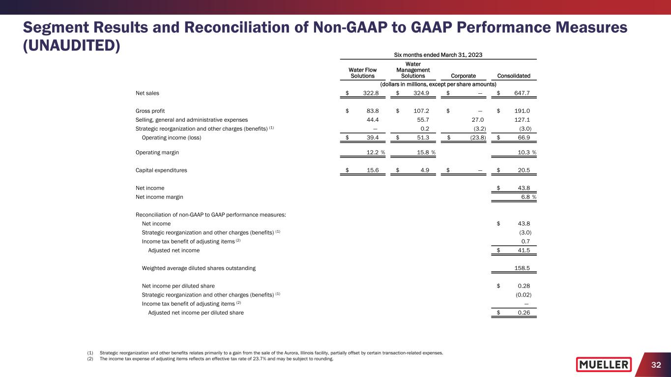 31 Segment Results and Reconciliation of Non-GAAP to GAAP Performance Measures (UNAUDITED) Six months ended March 31, 2024 Water Flow Solutions Water Management Solutions Corporate Consolidated (dollars in millions, except per share amounts) Net income $ 58.6 Income tax expense (3) 17.2 Other expense 1.6 Interest expense, net (3) 6.9 Pension expense other than service (3) 2.0 Operating income (loss) $ 79.8 $ 44.1 $ (37.6) 86.3 Strategic reorganization and other charges (1) 0.2 — 9.6 9.8 Adjusted operating income (loss) 80.0 44.1 (28.0) 96.1 Pension expense other than service — — (2.0) (2.0) Depreciation and amortization 19.1 13.7 0.1 32.9 Adjusted EBITDA $ 99.1 $ 57.8 $ (29.9) $ 127.0 Adjusted operating margin 23.0 % 16.8 % 15.8 % Adjusted EBITDA margin 28.6 % 22.0 % 20.8 % Reconciliation of free cash flow to net cash provided by operating activities: Net cash provided by operating activities $ 62.2 Less capital expenditures 15.8 Free cash flow $ 46.4 (1) The Company recorded approximately $9.8 million in Strategic reorganization and other charges, including $1.5 million of expenses related to the cybersecurity incidents as well as expenses associated with our leadership transition, severance and certain transaction-related expenses. (2) The income tax expense of adjusting items reflects an effective tax rate of 22.7% and may be subject to rounding. (3) The Company does not allocate interest, income taxes or pension amounts other than service to its segments.