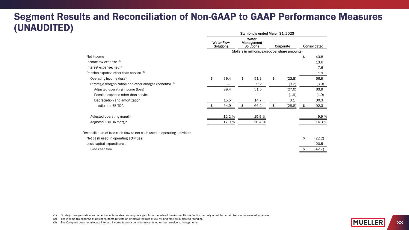 32 Segment Results and Reconciliation of Non-GAAP to GAAP Performance Measures (UNAUDITED) Six months ended March 31, 2023 Water Flow Solutions Water Management Solutions Corporate Consolidated (dollars in millions, except per share amounts) Net sales $ 322.8 $ 324.9 $ — $ 647.7 Gross profit $ 83.8 $ 107.2 $ — $ 191.0 Selling, general and administrative expenses 44.4 55.7 27.0 127.1 Strategic reorganization and other charges (benefits) (1) — 0.2 (3.2) (3.0) Operating income (loss) $ 39.4 $ 51.3 $ (23.8) $ 66.9 Operating margin 12.2 % 15.8 % 10.3 % Capital expenditures $ 15.6 $ 4.9 $ — $ 20.5 Net income $ 43.8 Net income margin 6.8 % Reconciliation of non-GAAP to GAAP performance measures: Net income $ 43.8 Strategic reorganization and other charges (benefits) (1) (3.0) Income tax benefit of adjusting items (2) 0.7 Adjusted net income $ 41.5 Weighted average diluted shares outstanding 158.5 Net income per diluted share $ 0.28 Strategic reorganization and other charges (benefits) (1) (0.02) Income tax benefit of adjusting items (2) — Adjusted net income per diluted share $ 0.26 (1) Strategic reorganization and other benefits relates primarily to a gain from the sale of the Aurora, Illinois facility, partially offset by certain transaction-related expenses. (2) The income tax expense of adjusting items reflects an effective tax rate of 23.7% and may be subject to rounding.