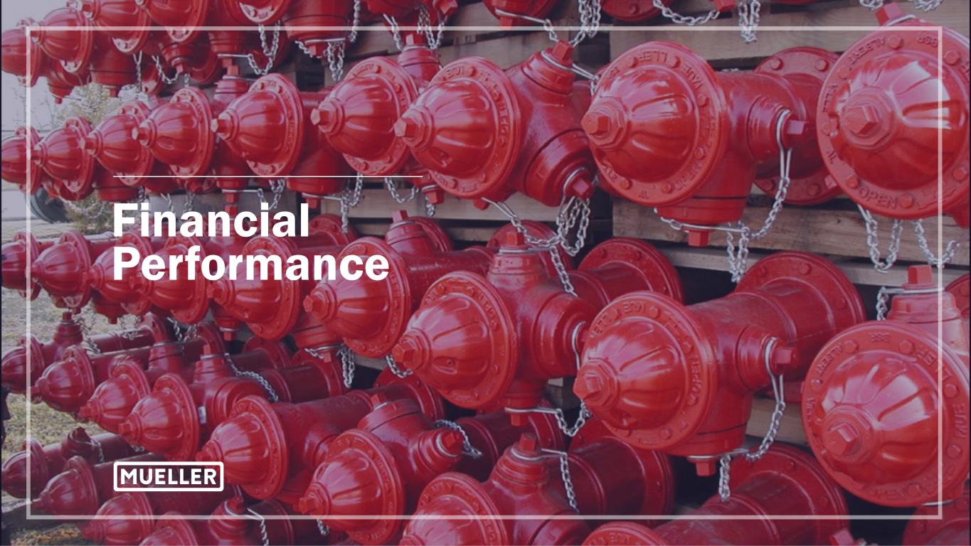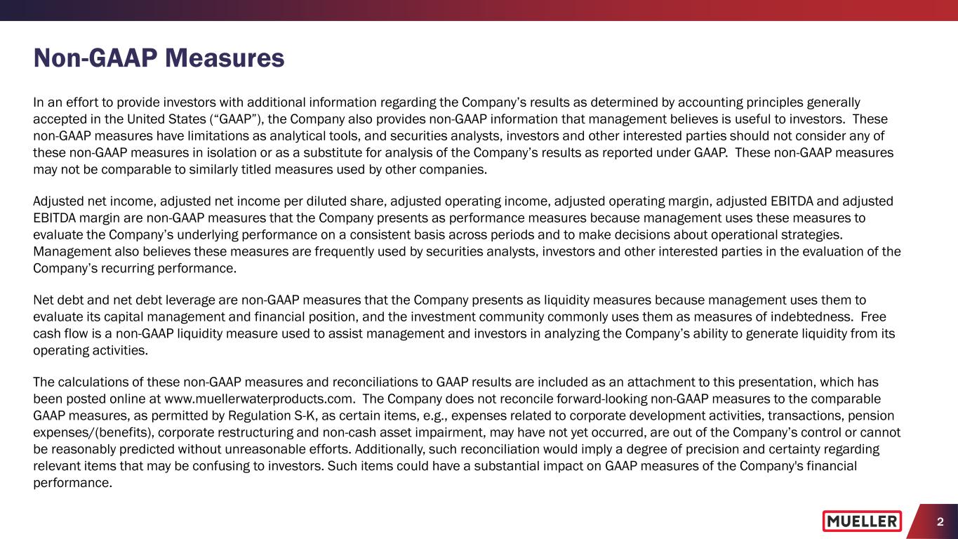 2 Non-GAAP Measures In an effort to provide investors with additional information regarding the Company’s results as determined by accounting principles generally accepted in the United States (“GAAP”), the Company also provides non-GAAP information that management believes is useful to investors. These non-GAAP measures have limitations as analytical tools, and securities analysts, investors and other interested parties should not consider any of these non-GAAP measures in isolation or as a substitute for analysis of the Company’s results as reported under GAAP. These non-GAAP measures may not be comparable to similarly titled measures used by other companies. Adjusted net income, adjusted net income per diluted share, adjusted operating income, adjusted operating margin, adjusted EBITDA and adjusted EBITDA margin are non-GAAP measures that the Company presents as performance measures because management uses these measures to evaluate the Company’s underlying performance on a consistent basis across periods and to make decisions about operational strategies. Management also believes these measures are frequently used by securities analysts, investors and other interested parties in the evaluation of the Company’s recurring performance. Net debt and net debt leverage are non-GAAP measures that the Company presents as liquidity measures because management uses them to evaluate its capital management and financial position, and the investment community commonly uses them as measures of indebtedness. Free cash flow is a non-GAAP liquidity measure used to assist management and investors in analyzing the Company’s ability to generate liquidity from its operating activities. The calculations of these non-GAAP measures and reconciliations to GAAP results are included as an attachment to this presentation, which has been posted online at www.muellerwaterproducts.com. The Company does not reconcile forward-looking non-GAAP measures to the comparable GAAP measures, as permitted by Regulation S-K, as certain items, e.g., expenses related to corporate development activities, transactions, pension expenses/(benefits), corporate restructuring and non-cash asset impairment, may have not yet occurred, are out of the Company’s control or cannot be reasonably predicted without unreasonable efforts. Additionally, such reconciliation would imply a degree of precision and certainty regarding relevant items that may be confusing to investors. Such items could have a substantial impact on GAAP measures of the Company's financial performance.