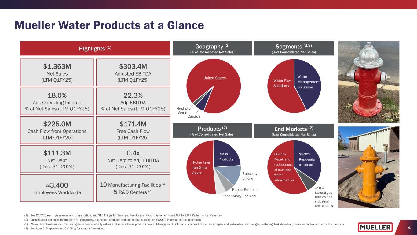 3 Forward-Looking Statements This presentation contains certain statements that may be deemed “forward-looking statements” within the meaning of the federal securities laws. All statements that address activities, events or developments that the Company intends, expects, plans, projects, believes or anticipates will or may occur in the future are forward-looking statements, including, without limitation, statements regarding outlooks, projections, forecasts, expectations, commitments, trend descriptions and the ability to capitalize on trends, value creation, Board of Directors and committee composition plans, long-term strategies and the execution or acceleration thereof, operational improvements, inventory positions, the benefits of capital investments, financial or operating performance, including driving increased margins, operational and commercial initiatives, capital allocation and growth strategy plans, and the demand for the Company’s products. Forward-looking statements are based on certain assumptions and assessments made by the Company in light of the Company’s experience and perception of historical trends, current conditions and expected future developments. Actual results and the timing of events may differ materially from those contemplated by the forward-looking statements due to a number of factors, including, without limitation, logistical challenges and supply chain disruptions, geopolitical conditions, including the Israel-Hamas war, public health crises, or other events; inventory and in- stock positions of our distributors and end customers; an inability to realize the anticipated benefits from our operational initiatives, including our large capital investments in Decatur, Illinois, plant closures, and reorganization and related strategic realignment activities; an inability to attract or retain a skilled and diverse workforce, including executive officers, increased competition related to the workforce and labor markets; an inability to protect the Company’s information systems against further service interruption, risks resulting from possible future cybersecurity incidents, misappropriation of data or breaches of security; failure to comply with personal data protection and privacy laws; cyclical and changing demand in core markets such as municipal spending, residential construction, and natural gas distribution; government monetary or fiscal policies; the impact of adverse weather conditions; the impact of manufacturing and product performance; the impact of wage, commodity and materials price inflation; foreign exchange rate fluctuations; the impact of higher interest rates; the impact of warranty charges and claims, and related accommodations; the strength of our brands and reputation; an inability to successfully resolve significant legal proceedings or government investigations; compliance with environmental, trade and anti- corruption laws and regulations; climate change and legal or regulatory responses thereto; changing regulatory, trade and tariff conditions; the failure to integrate and/or realize any of the anticipated benefits of acquisitions or divestitures; an inability to achieve some or all of our goals and commitments in environmental and sustainability programs; and other factors that are described in the section entitled “RISK FACTORS” in Item 1A of the Company’s most recent Annual Report on Form 10-K and later filings on Form 10-Q, as applicable. Forward-looking statements do not guarantee future performance and are only as of the date they are made. The Company undertakes no duty to update its forward- looking statements except as required by law. Undue reliance should not be placed on any forward-looking statements. You are advised to review any further disclosures the Company makes on related subjects in subsequent Forms 10-K, 10-Q, 8-K and other reports filed with the U.S. Securities and Exchange Commission.