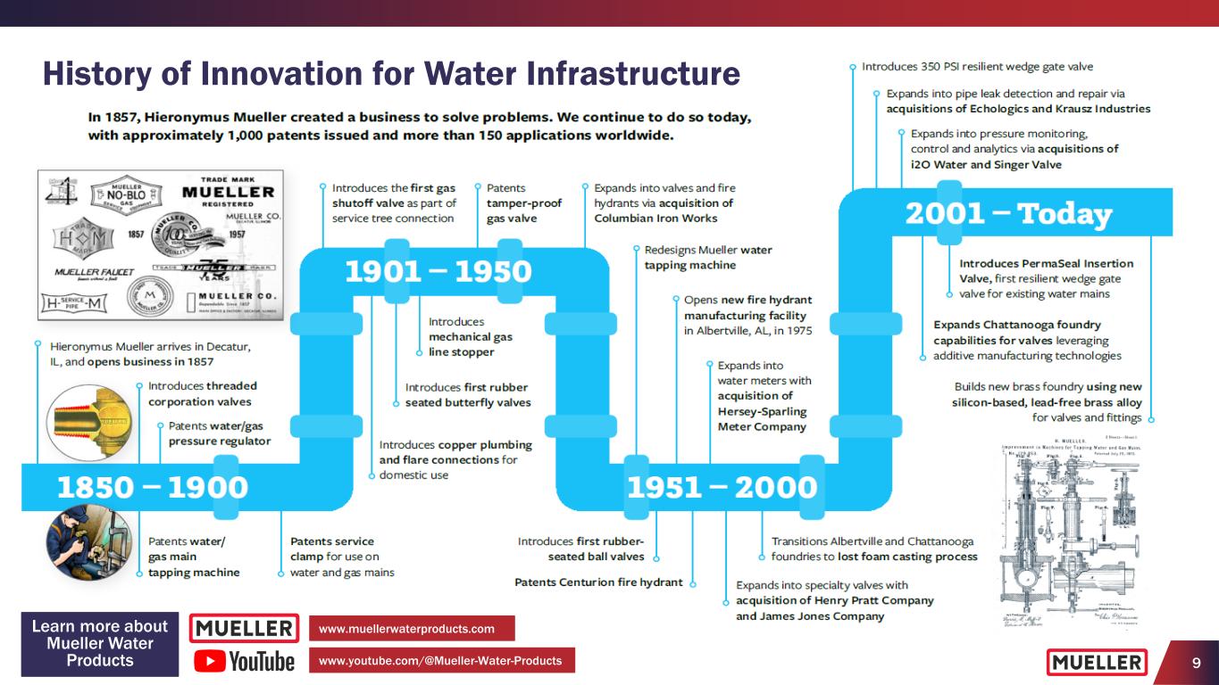 9 History of Innovation for Water Infrastructure www.youtube.com/@Mueller-Water-Products www.muellerwaterproducts.comLearn more about Mueller Water Products