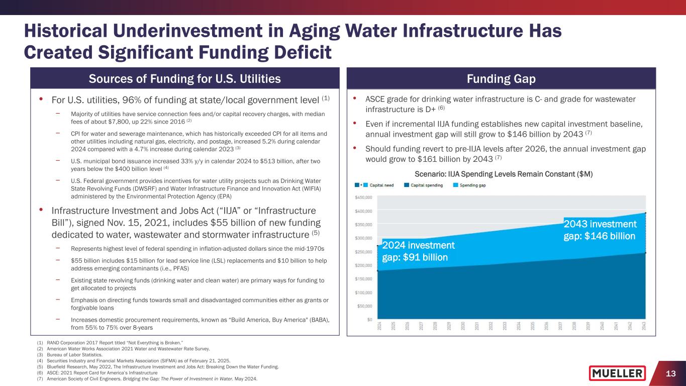 12 Aging Pipe Infrastructure and Water Main Breaks Utah State Study on Water Main Break Rates (1) • Surveyed more than 800 water utilities with nearly 400,000 miles of water mains in the U.S. and Canada, representing approximately 17% of the estimated total length • Experience ≈260,000 water main breaks annually, which represent ≈$2.6 billion annually in maintenance and repair costs • Distribution pipes (12 in. and smaller) represent 86% of water mains with overall failure rates of 13.3 breaks/(100 miles-year) • 90% of installed or in-service water mains combination of PVC (29%), ductile iron (27%), cast iron (23%), asbestos cement (11%) • A total of 19.4% of installed water mains are beyond their useful lives, representing approximately 452,000 miles of pipe • More concerning is the breakage rates of cast iron and asbestos cement pipe, which make up 33% of the installed water mains in the U.S. and Canada − 86% of cast iron pipes are more than 50 years old and have overall failure rates of 28.6 breaks/(100 miles-year) − 41% of asbestos cement pipes are more than 50 years old and have overall failure rates of 10.3 breaks/(100 miles-year) (1) Utah State University, “Water Main Break Rates in the USA and Canada: A Comprehensive Study.“ December 2023, Professor Steven L. Barfuss, P.E. Distribution pipes are 12 inches or less in diameter. (2) Utah State University. “Water Main Break Rates in the USA and Canada: A Comprehensive Study,” March 2018, Steven Folkman. 13.3 Distribution pipe breaks per 100 miles per year (1) <1% replacement rate for pipe (2) 2.3 million miles of drinking water pipes in U.S. (1) 19% of installed water mains beyond useful life (1) 53 years Average age of failing water mains (1) 260,000 Pipe failures per year, or >700 per day (1)