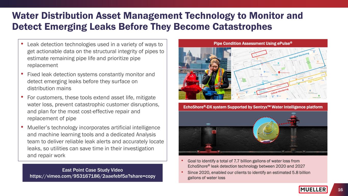 15 Technology-Enabled Products and Solutions Help Address Critical Needs for Water Utilities ControlMonitor Manage Optimize Mueller’s Product Offerings Aging Infrastructure Non-Revenue Water Climate Change Population Shifts Water Scarcity Aging Workforce Consumer Awareness Digitization Challenges Facing Water Utilities Urbanization Fixed Leak Detection and Pipe Condition Assessment Metering Pressure Monitoring and Control “Bluefield projects digital water spending in U.S. and Canada to grow at an 8.4% CAGR (2024 to 2033), highlighting the increasing reliance on digital solutions to manage water infrastructure more efficiently.” (1) Bluefield Research, August 2024 (1) Bluefield Research, August 2024, “U.S. & Canada Digital Water Market Outlook. Key Drivers, Competitive Shifts, and Forecasts, 2024–2033”