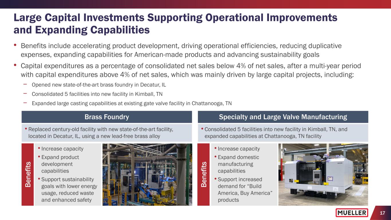 17 Large Capital Investments Supporting Operational Improvements and Expanding Capabilities • Benefits include accelerating product development, driving operational efficiencies, reducing duplicative expenses, expanding capabilities for American-made products and advancing sustainability goals • Capital expenditures as a percentage of consolidated net sales below 4% of net sales, after a multi-year period with capital expenditures above 4% of net sales, which was mainly driven by large capital projects, including: − Opened new state-of-the-art brass foundry in Decatur, IL − Consolidated 5 facilities into new facility in Kimball, TN − Expanded large casting capabilities at existing gate valve facility in Chattanooga, TN Brass Foundry • Replaced century-old facility with new state-of-the-art facility, located in Decatur, IL, using a new lead-free brass alloy Specialty and Large Valve Manufacturing • Consolidated 5 facilities into new facility in Kimball, TN, and expanded capabilities at Chattanooga, TN facility • Increase capacity • Expand product development capabilities • Support sustainability goals with lower energy usage, reduced waste and enhanced safety • Increase capacity • Expand domestic manufacturing capabilities • Support increased demand for “Build America, Buy America” products Be ne fit s Be ne fit s