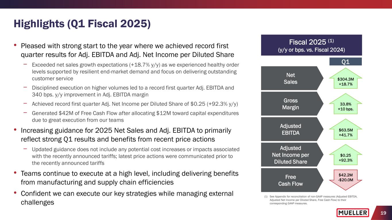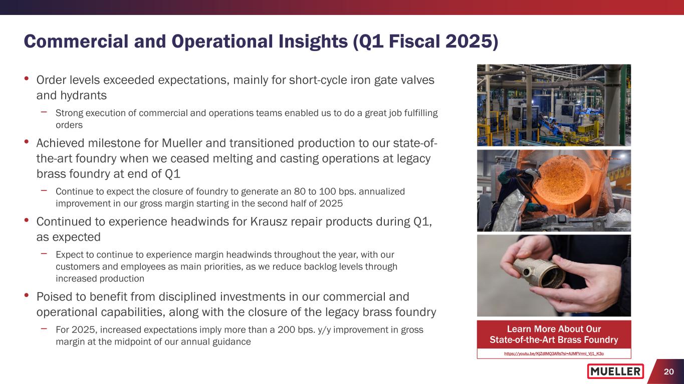 19 • Pleased with strong start to the year where we achieved record first quarter results for Adj. EBITDA and Adj. Net Income per Diluted Share − Exceeded net sales growth expectations (+18.7% y/y) as we experienced healthy order levels supported by resilient end-market demand and focus on delivering outstanding customer service − Disciplined execution on higher volumes led to a record first quarter Adj. EBITDA and 340 bps. y/y improvement in Adj. EBITDA margin − Achieved record first quarter Adj. Net Income per Diluted Share of $0.25 (+92.3% y/y) − Generated $42M of Free Cash Flow after allocating $12M toward capital expenditures due to great execution from our teams • Increasing guidance for 2025 Net Sales and Adj. EBITDA to primarily reflect strong Q1 results and benefits from recent price actions − Updated guidance does not include any potential cost increases or impacts associated with the recently announced tariffs; latest price actions were communicated prior to the recently announced tariffs • Teams continue to execute at a high level, including delivering benefits from manufacturing and supply chain efficiencies • Confident we can execute our key strategies while managing external challenges Highlights (Q1 Fiscal 2025) (1) See Appendix for reconciliation of non-GAAP measures (Adjusted EBITDA, Adjusted Net Income per Diluted Share, Free Cash Flow) to their corresponding GAAP measures. Q1 Fiscal 2025 (1) (y/y or bps. vs. Fiscal 2024) Net Sales $304.3M +18.7% Gross Margin 33.8% +10 bps. Adjusted EBITDA $63.5M +41.7% Free Cash Flow $42.2M -$20.0M Adjusted Net Income per Diluted Share $0.25 +92.3%