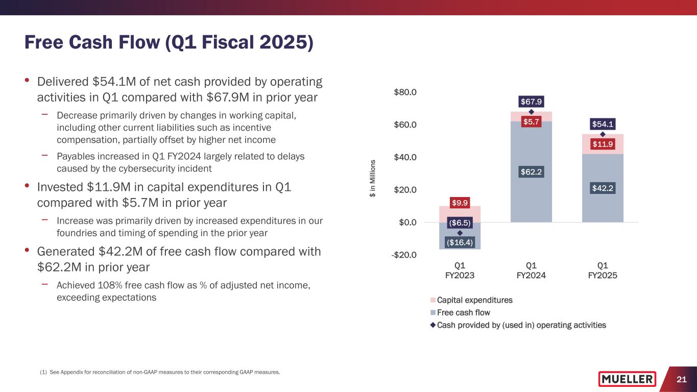 20 Commercial and Operational Insights (Q1 Fiscal 2025) • Order levels exceeded expectations, mainly for short-cycle iron gate valves and hydrants − Strong execution of commercial and operations teams enabled us to do a great job fulfilling orders • Achieved milestone for Mueller and transitioned production to our state-of- the-art foundry when we ceased melting and casting operations at legacy brass foundry at end of Q1 − Continue to expect the closure of foundry to generate an 80 to 100 bps. annualized improvement in our gross margin starting in the second half of 2025 • Continued to experience headwinds for Krausz repair products during Q1, as expected − Expect to continue to experience margin headwinds throughout the year, with our customers and employees as main priorities, as we reduce backlog levels through increased production • Poised to benefit from disciplined investments in our commercial and operational capabilities, along with the closure of the legacy brass foundry − For 2025, increased expectations imply more than a 200 bps. y/y improvement in gross margin at the midpoint of our annual guidance Learn More About Our State-of-the-Art Brass Foundry https://youtu.be/KjZdIMQ3ARs?si=AJMFVrmi_Vj1_K3o