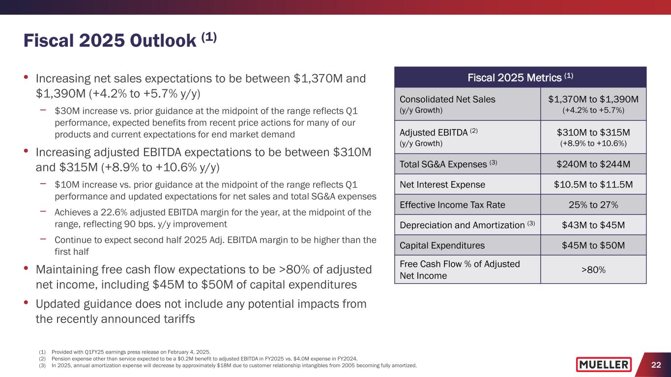 21 Free Cash Flow (Q1 Fiscal 2025) • Delivered $54.1M of net cash provided by operating activities in Q1 compared with $67.9M in prior year − Decrease primarily driven by changes in working capital, including other current liabilities such as incentive compensation, partially offset by higher net income − Payables increased in Q1 FY2024 largely related to delays caused by the cybersecurity incident • Invested $11.9M in capital expenditures in Q1 compared with $5.7M in prior year − Increase was primarily driven by increased expenditures in our foundries and timing of spending in the prior year • Generated $42.2M of free cash flow compared with $62.2M in prior year − Achieved 108% free cash flow as % of adjusted net income, exceeding expectations ($16.4) $62.2 $42.2 $9.9 $5.7 $11.9 ($6.5) $67.9 $54.1 -$20.0 $0.0 $20.0 $40.0 $60.0 $80.0 Q1 FY2023 Q1 FY2024 Q1 FY2025 $ in M ill io ns Capital expenditures Free cash flow Cash provided by (used in) operating activities (1) See Appendix for reconciliation of non-GAAP measures to their corresponding GAAP measures.