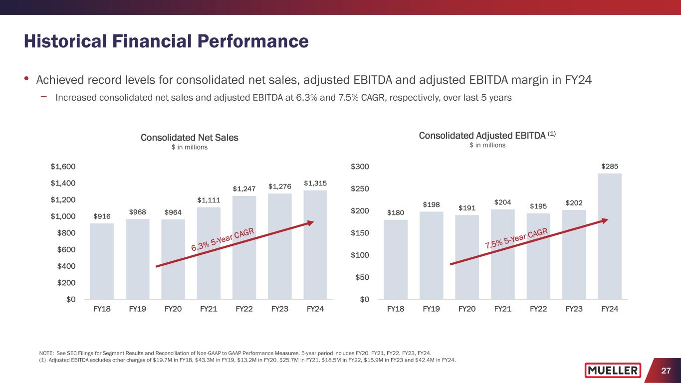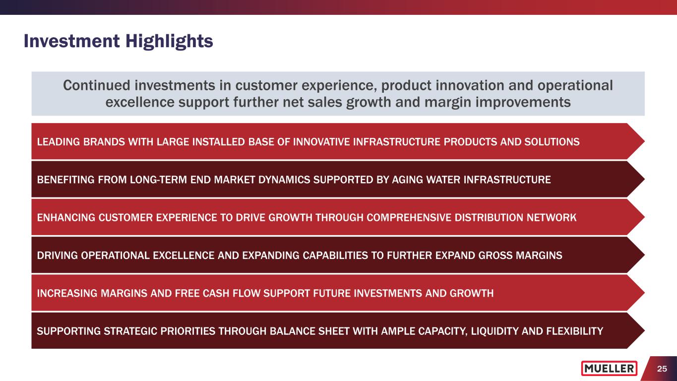24 Balanced and Disciplined Capital Allocation • Disciplined capital investments in operations – Capital expenditures as a percentage of consolidated net sales below 4% of net sales, after a multi-year period with capital expenditures above 4% of net sales, which was mainly driven by large capital projects • Targeted approach to acquisitions – Expand product portfolio, leverage distribution network and manufacturing capabilities • Continued return of cash to shareholders through quarterly dividend and share repurchases – Paid quarterly dividend since becoming a publicly-traded company – Increased quarterly dividend 10 times since FY14 – Allocated $70M to share repurchases since FY19, including $10M in FY24, and have $80M remaining authorization on share repurchase program as of December 31, 2024 Shareholders 43% Balance Sheet* 6% Strategic Investments* 51% $252M to Shareholders - $182M dividends - $70M share repurchases 5-Year Cash Allocation (FY20-FY24)* $305M to Strategic Investments - $280M capital expenditures - $25M acquisitions * 5-year period includes FY20, FY21, FY22, FY23, FY24; Strategic Investments includes consolidated capital expenditures and cash paid for acquisitions of Pratt Industrial JV and i2O Water (excludes proceeds from sales of assets); Balance Sheet includes debt retirement and $22M payment for Walter Tax Settlement). Capital Allocation Priorities Balanced approach to capital allocation to strengthen and grow the business through capital investments and bolt-on acquisitions while continuing to return cash to shareholders