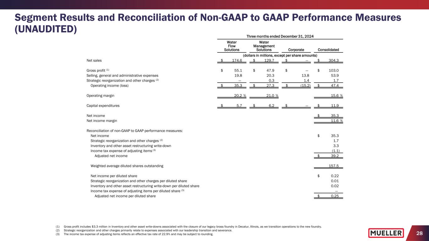 28 Segment Results and Reconciliation of Non-GAAP to GAAP Performance Measures (UNAUDITED) (1) Gross profit includes $3.3 million in Inventory and other asset write-downs associated with the closure of our legacy brass foundry in Decatur, Illinois, as we transition operations to the new foundry. (2) Strategic reorganization and other charges primarily relate to expenses associated with our leadership transition and severance. (3) The income tax expense of adjusting items reflects an effective tax rate of 22.9% and may be subject to rounding. Three months ended December 31, 2024 Water Flow Solutions Water Management Solutions Corporate Consolidated (dollars in millions, except per share amounts) Net sales $ 174.6 $ 129.7 $ — $ 304.3 Gross profit (1) $ 55.1 $ 47.9 $ — $ 103.0 Selling, general and administrative expenses 19.8 20.3 13.8 53.9 Strategic reorganization and other charges (2) — 0.3 1.4 1.7 Operating income (loss) $ 35.3 $ 27.3 $ (15.2) $ 47.4 Operating margin 20.2 % 21.0 % 15.6 % Capital expenditures $ 5.7 $ 6.2 $ — $ 11.9 Net income $ 35.3 Net income margin 11.6 % Reconciliation of non-GAAP to GAAP performance measures: Net income $ 35.3 Strategic reorganization and other charges (2) 1.7 Inventory and other asset restructuring write-down 3.3 Income tax expense of adjusting items (3) (1.1) Adjusted net income $ 39.2 Weighted average diluted shares outstanding 157.5 Net income per diluted share $ 0.22 Strategic reorganization and other charges per diluted share 0.01 Inventory and other asset restructuring write-down per diluted share 0.02 Income tax expense of adjusting items per diluted share (3) — Adjusted net income per diluted share $ 0.25