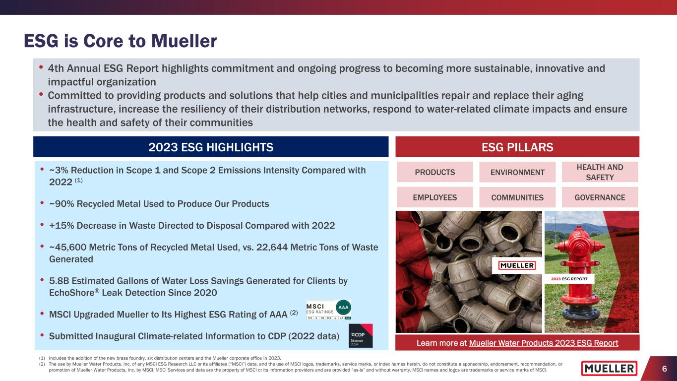 5 Why Invest in Mueller LEADING BRANDS WITH LARGE INSTALLED BASE OF INNOVATIVE INFRASTRUCTURE PRODUCTS AND SOLUTIONS BENEFITING FROM LONG-TERM END MARKET DYNAMICS SUPPORTED BY AGING WATER INFRASTRUCTURE DRIVING OPERATIONAL EXCELLENCE AND EXPANDING CAPABILITIES TO FURTHER EXPAND GROSS MARGINS ENHANCING CUSTOMER EXPERIENCE TO DRIVE GROWTH THROUGH COMPREHENSIVE DISTRIBUTION NETWORK INCREASING MARGINS AND FREE CASH FLOW SUPPORT FUTURE INVESTMENTS AND GROWTH Continued investments in customer experience, product innovation and operational excellence support further net sales growth and margin improvements SUPPORTING STRATEGIC PRIORITIES THROUGH BALANCE SHEET WITH AMPLE CAPACITY, LIQUIDITY AND FLEXIBILITY