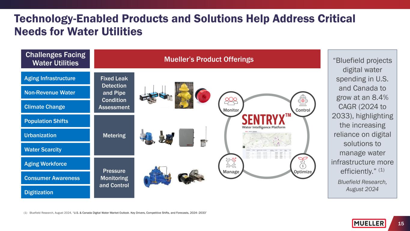 15 Technology-Enabled Products and Solutions Help Address Critical Needs for Water Utilities ControlMonitor Manage Optimize Mueller’s Product Offerings Aging Infrastructure Non-Revenue Water Climate Change Population Shifts Water Scarcity Aging Workforce Consumer Awareness Digitization Challenges Facing Water Utilities Urbanization Fixed Leak Detection and Pipe Condition Assessment Metering Pressure Monitoring and Control “Bluefield projects digital water spending in U.S. and Canada to grow at an 8.4% CAGR (2024 to 2033), highlighting the increasing reliance on digital solutions to manage water infrastructure more efficiently.” (1) Bluefield Research, August 2024 (1) Bluefield Research, August 2024, “U.S. & Canada Digital Water Market Outlook. Key Drivers, Competitive Shifts, and Forecasts, 2024–2033”