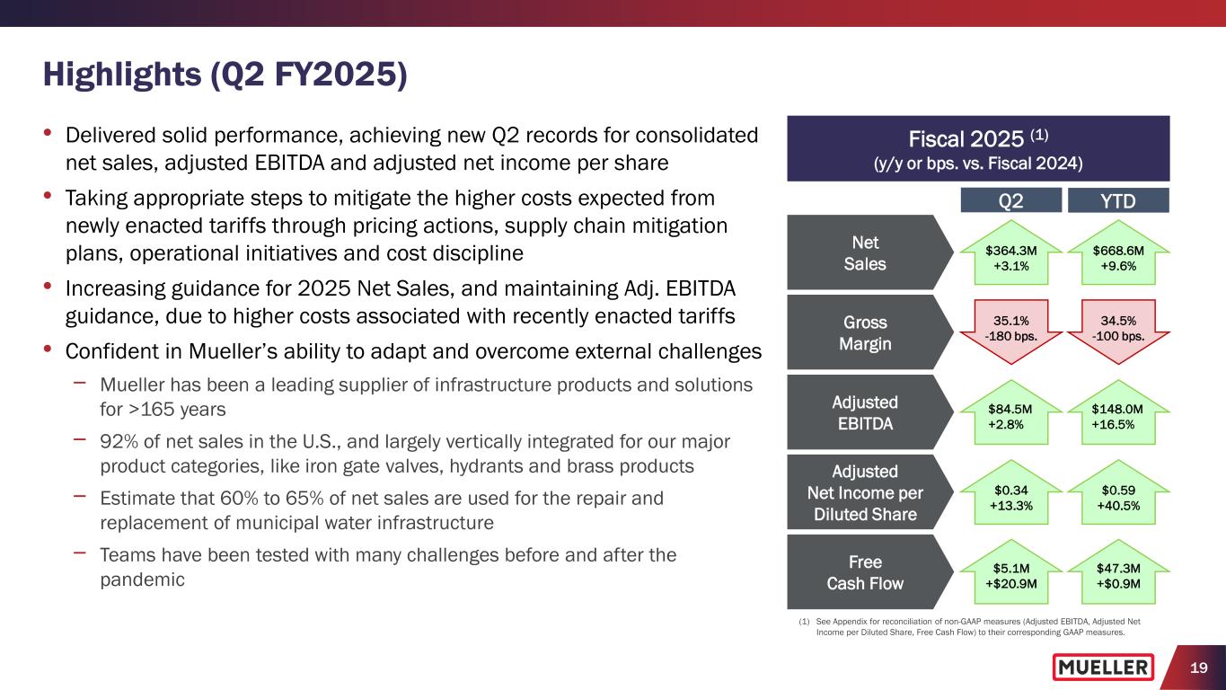 19 • Delivered solid performance, achieving new Q2 records for consolidated net sales, adjusted EBITDA and adjusted net income per share • Taking appropriate steps to mitigate the higher costs expected from newly enacted tariffs through pricing actions, supply chain mitigation plans, operational initiatives and cost discipline • Increasing guidance for 2025 Net Sales, and maintaining Adj. EBITDA guidance, due to higher costs associated with recently enacted tariffs • Confident in Mueller’s ability to adapt and overcome external challenges − Mueller has been a leading supplier of infrastructure products and solutions for >165 years − 92% of net sales in the U.S., and largely vertically integrated for our major product categories, like iron gate valves, hydrants and brass products − Estimate that 60% to 65% of net sales are used for the repair and replacement of municipal water infrastructure − Teams have been tested with many challenges before and after the pandemic Highlights (Q2 FY2025) (1) See Appendix for reconciliation of non-GAAP measures (Adjusted EBITDA, Adjusted Net Income per Diluted Share, Free Cash Flow) to their corresponding GAAP measures. Q2 Fiscal 2025 (1) (y/y or bps. vs. Fiscal 2024) Net Sales $364.3M +3.1% Gross Margin 35.1% -180 bps. Adjusted EBITDA $84.5M +2.8% Free Cash Flow $5.1M +$20.9M Adjusted Net Income per Diluted Share $0.34 +13.3% YTD $668.6M +9.6% 34.5% -100 bps. $148.0M +16.5% $0.59 +40.5% $47.3M +$0.9M