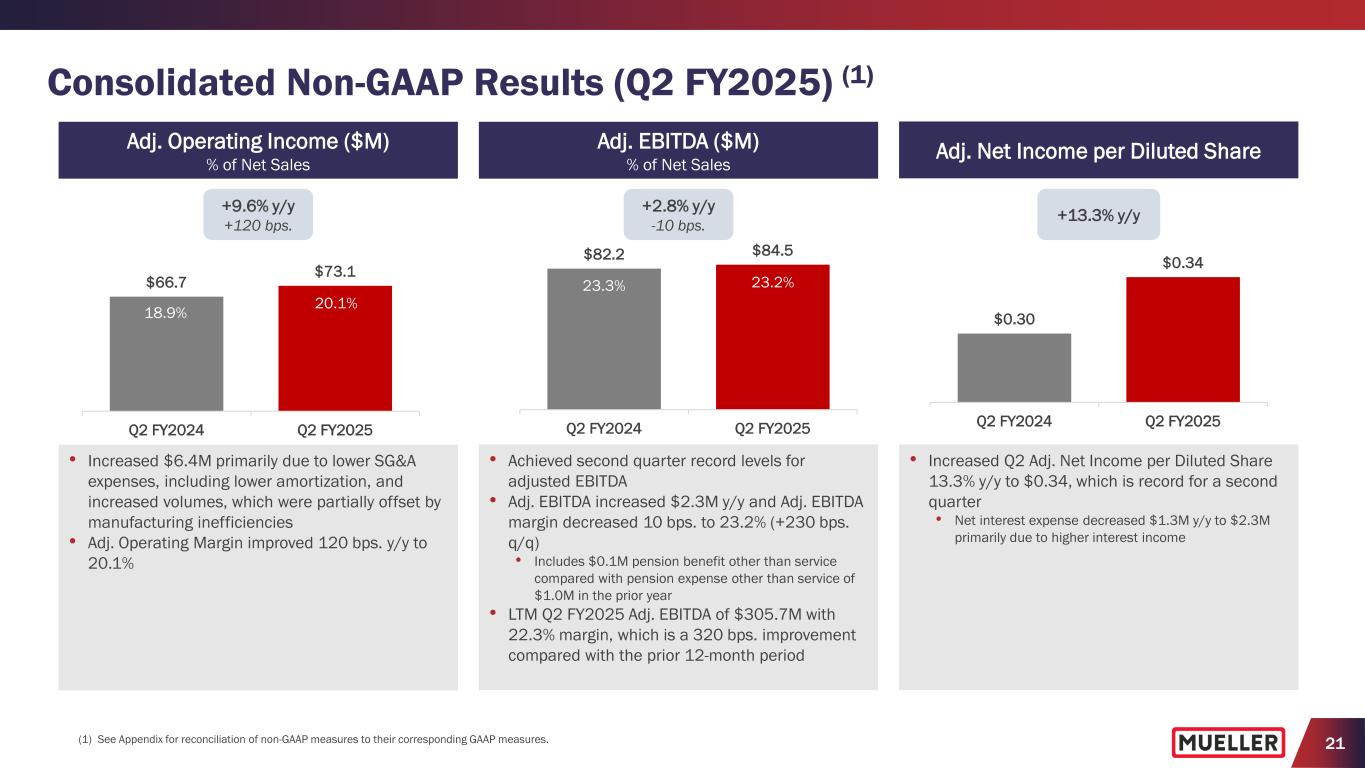 20 $63.5 $69.9 Q2 FY2024 Q2 FY2025 $63.7 $55.7 Q2 FY2024 Q2 FY2025 $130.4 $128.0 Q2 FY2024 Q2 FY2025 Net Sales ($M) SG&A ($M) % of Net Sales Gross Profit ($M) % of Net Sales Operating Income ($M) % of Net Sales -1.8% y/y -180 bps. -12.6% y/y -270 bps. 35.1% 15.3% 18.0% 18.0% 19.2% +10.1% y/y +120 bps. 36.9% Consolidated GAAP Results (Q2 FY2025) +3.1% y/y $353.4 $364.3 Q2 FY2024 Q2 FY2025 • Surpassed record net sales in Q2 FY2024, which increased 6.2% y/y • Increase primarily due to higher pricing and increased volumes across most product lines • Increases in net sales at both segments with WFS +5.1% y/y and WMS +0.3% y/y • Decreased 180 bps. as benefits from increased volumes were more than offset by manufacturing inefficiencies, most of which were expected as a result of the brass foundry transition • Excluding $0.8M in asset write- downs associated with legacy brass foundry closure, gross margin would have been 35.4%, -150 bps. y/y • Continue to expect margin benefits in 2nd half from legacy brass foundry closure • Decreased $8.0M y/y due to lower amortization expense, favorable foreign fluctuation and diligent expense management of third-party fees and personnel-related costs, partially offset by inflationary pressures • Increase primarily due to lower SG&A and lower strategic reorganization and other charges, partially offset by lower gross profit • Includes $2.4M of strategic reorganization and other charges, primarily related to the leadership transition and fixed asset impairment, and $0.8M in other asset write-downs associated with the closure of legacy brass foundry