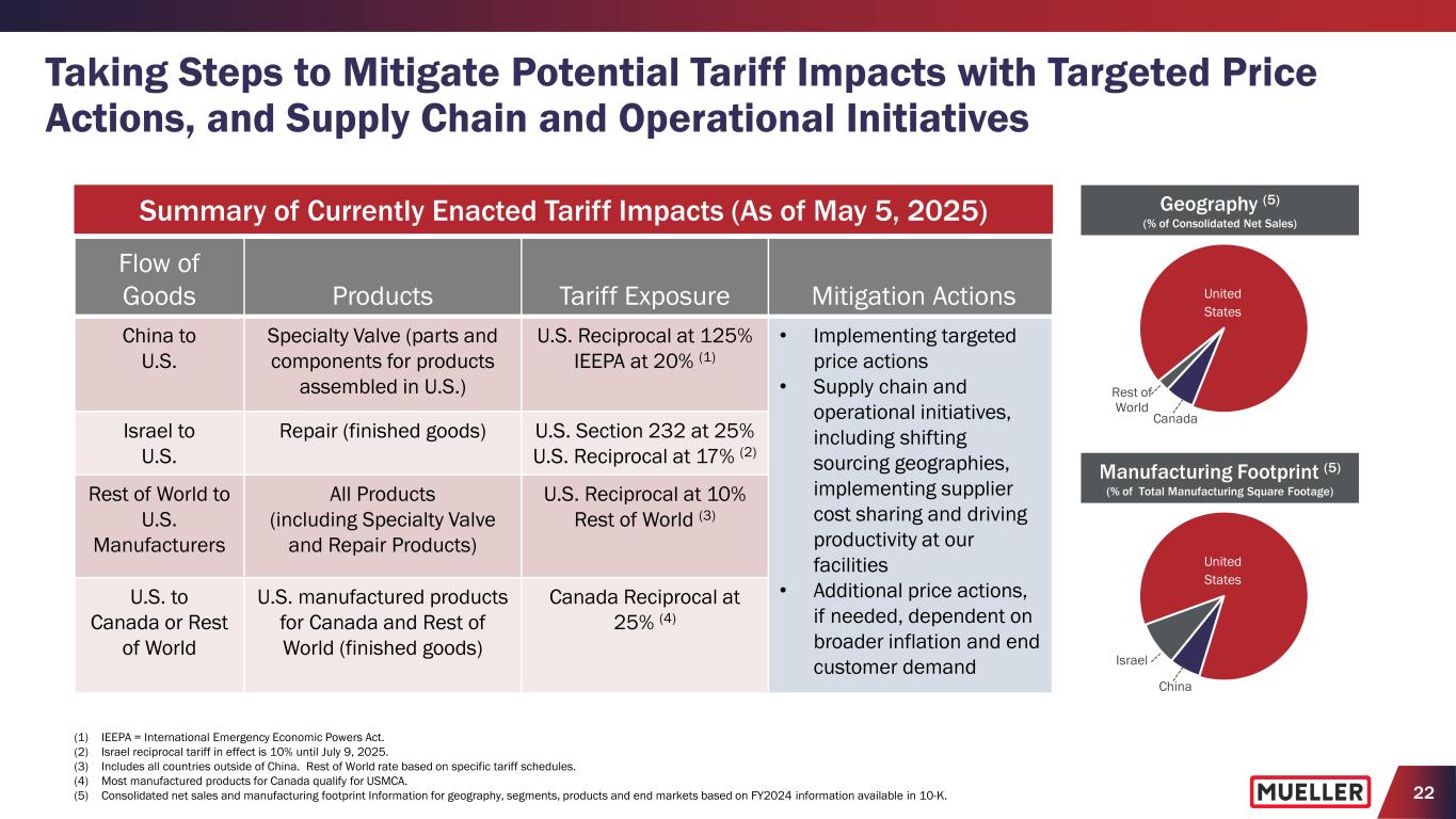 21 $82.2 $84.5 Q2 FY2024 Q2 FY2025 $66.7 $73.1 Q2 FY2024 Q2 FY2025 Adj. Operating Income ($M) % of Net Sales Adj. Net Income per Diluted ShareAdj. EBITDA ($M) % of Net Sales +2.8% y/y -10 bps. +9.6% y/y +120 bps. +13.3% y/y 18.9% 20.1% 23.3% 23.2% Consolidated Non-GAAP Results (Q2 FY2025) (1) (1) See Appendix for reconciliation of non-GAAP measures to their corresponding GAAP measures. $0.30 $0.34 Q2 FY2024 Q2 FY2025 • Increased $6.4M primarily due to lower SG&A expenses, including lower amortization, and increased volumes, which were partially offset by manufacturing inefficiencies • Adj. Operating Margin improved 120 bps. y/y to 20.1% • Achieved second quarter record levels for adjusted EBITDA • Adj. EBITDA increased $2.3M y/y and Adj. EBITDA margin decreased 10 bps. to 23.2% (+230 bps. q/q) • Includes $0.1M pension benefit other than service compared with pension expense other than service of $1.0M in the prior year • LTM Q2 FY2025 Adj. EBITDA of $305.7M with 22.3% margin, which is a 320 bps. improvement compared with the prior 12-month period • Increased Q2 Adj. Net Income per Diluted Share 13.3% y/y to $0.34, which is record for a second quarter • Net interest expense decreased $1.3M y/y to $2.3M primarily due to higher interest income
