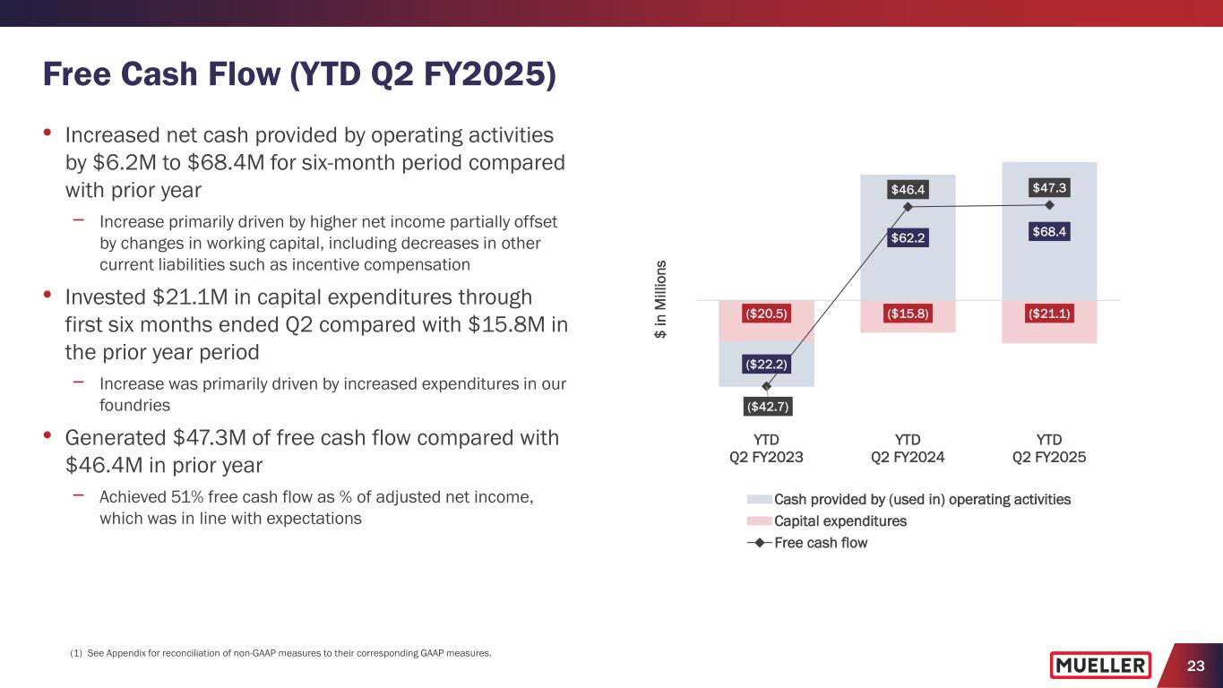 31 Segment Results and Reconciliation of Non-GAAP to GAAP Performance Measures (UNAUDITED) (1) Gross profit includes $0.8 million in other asset write-downs associated with the closure of our legacy brass foundry in Decatur, Illinois. (2) Strategic reorganization and other charges primarily relate to expenses associated with our leadership transition, non-cash asset impairment and certain transaction-related expenses. (3) The income tax expense of adjusting items reflects an effective tax rate of 24.2% and may be subject to rounding. Three months ended March 31, 2025 Water Flow Solutions Water Management Solutions Corporate Consolidated (dollars in millions, except per share amounts) Net sales $ 216.2 $ 148.1 $ — $ 364.3 Gross profit (1) $ 77.0 $ 51.0 $ — $ 128.0 Selling, general and administrative expenses 21.9 19.6 14.2 55.7 Strategic reorganization and other charges (2) 1.0 0.1 1.3 2.4 Operating income (loss) $ 54.1 $ 31.3 $ (15.5) $ 69.9 Operating margin 25.0 % 21.1 % 19.2 % Capital expenditures $ 4.8 $ 4.4 $ — $ 9.2 Net income $ 51.3 Net income margin 14.1 % Reconciliation of non-GAAP to GAAP performance measures: Net income $ 51.3 Strategic reorganization and other charges (2) 2.4 Other asset restructuring write-down 0.8 Income tax expense of adjusting items (3) (0.8) Adjusted net income $ 53.7 Weighted average diluted shares outstanding 157.5 Net income per diluted share $ 0.33 Strategic reorganization and other charges per diluted share (2) 0.02 Other asset restructuring write-down per diluted share 0.01 Income tax expense of adjusting items per diluted share (3) (0.02) Adjusted net income per diluted share $ 0.34